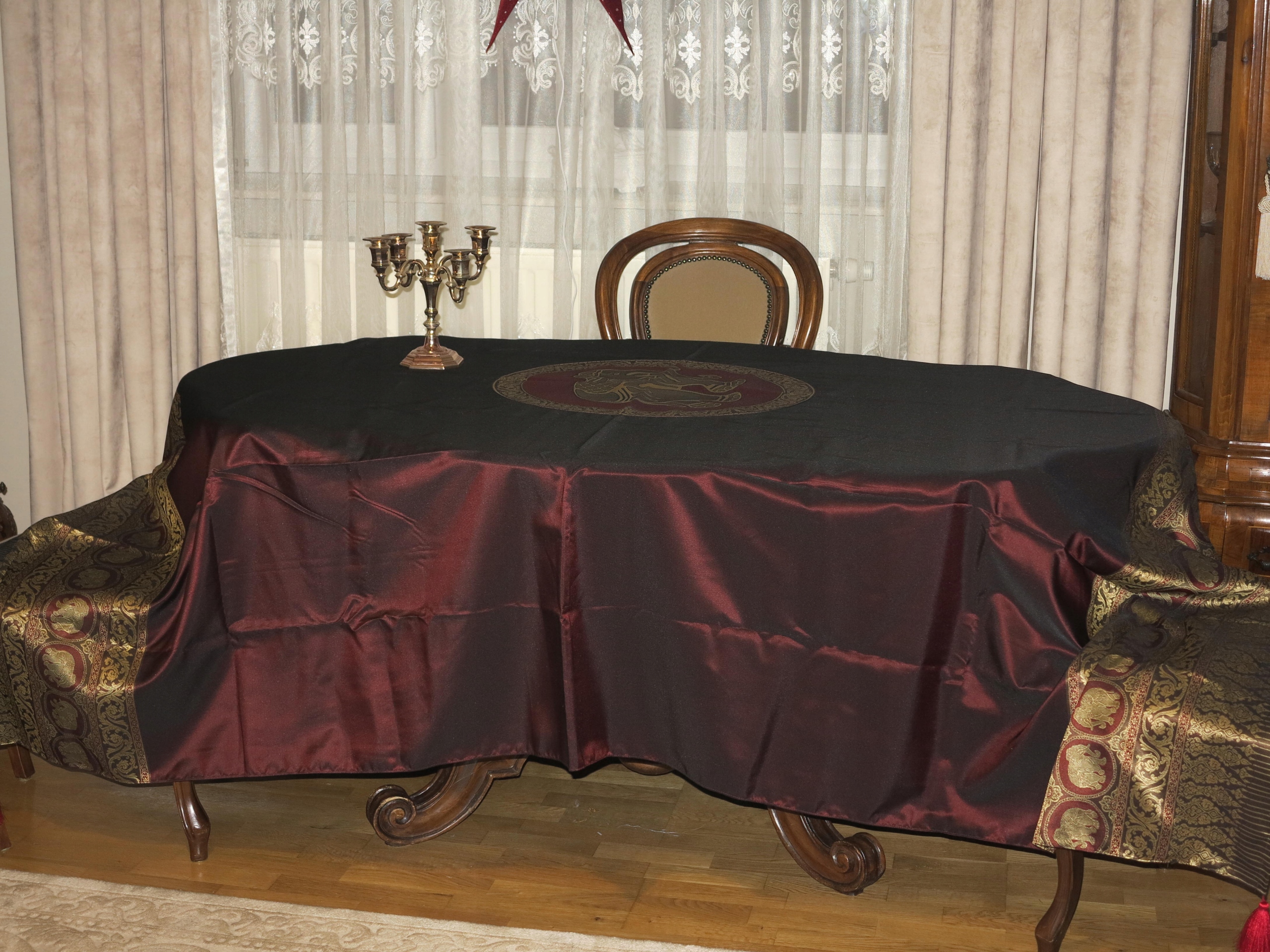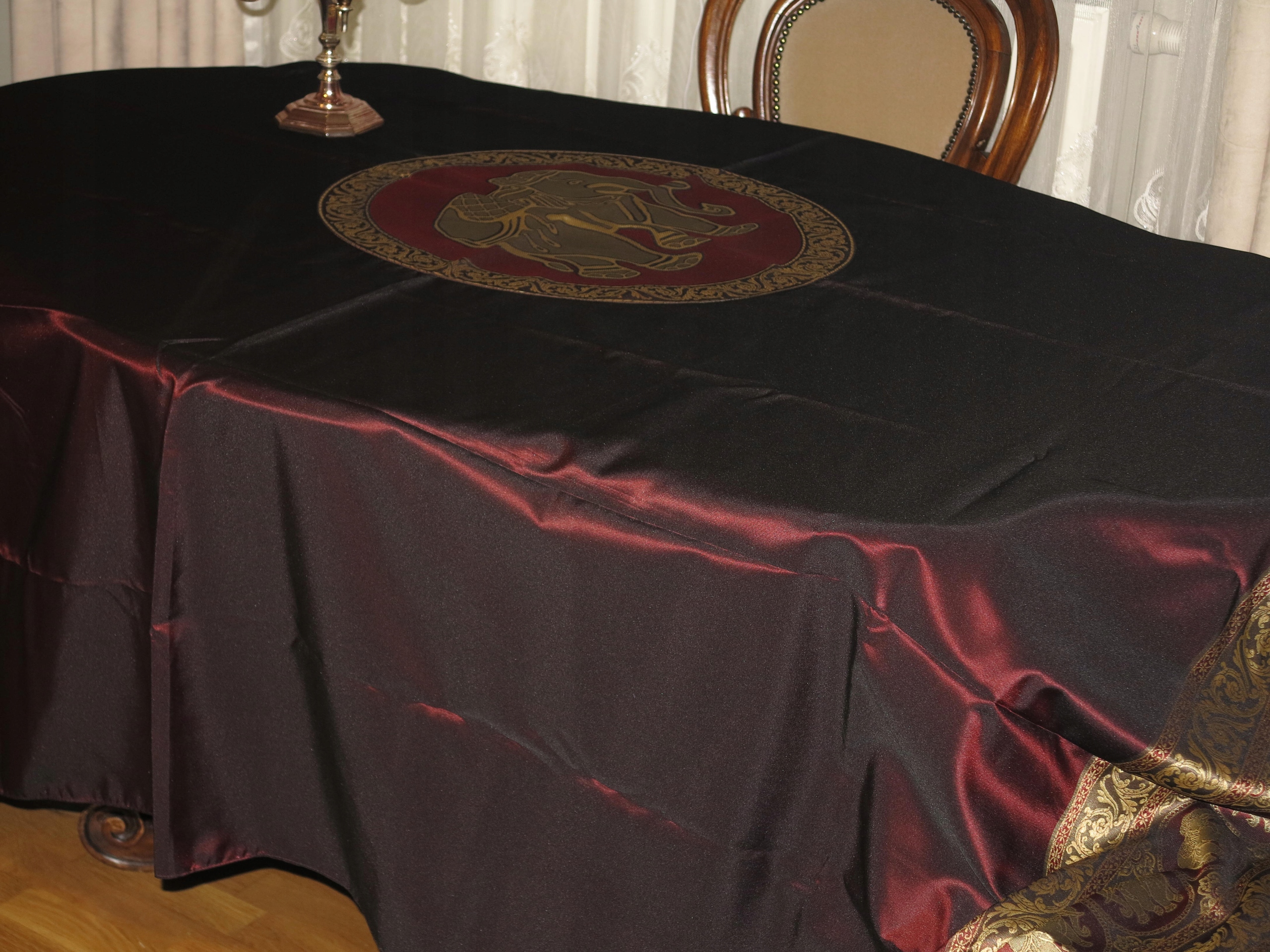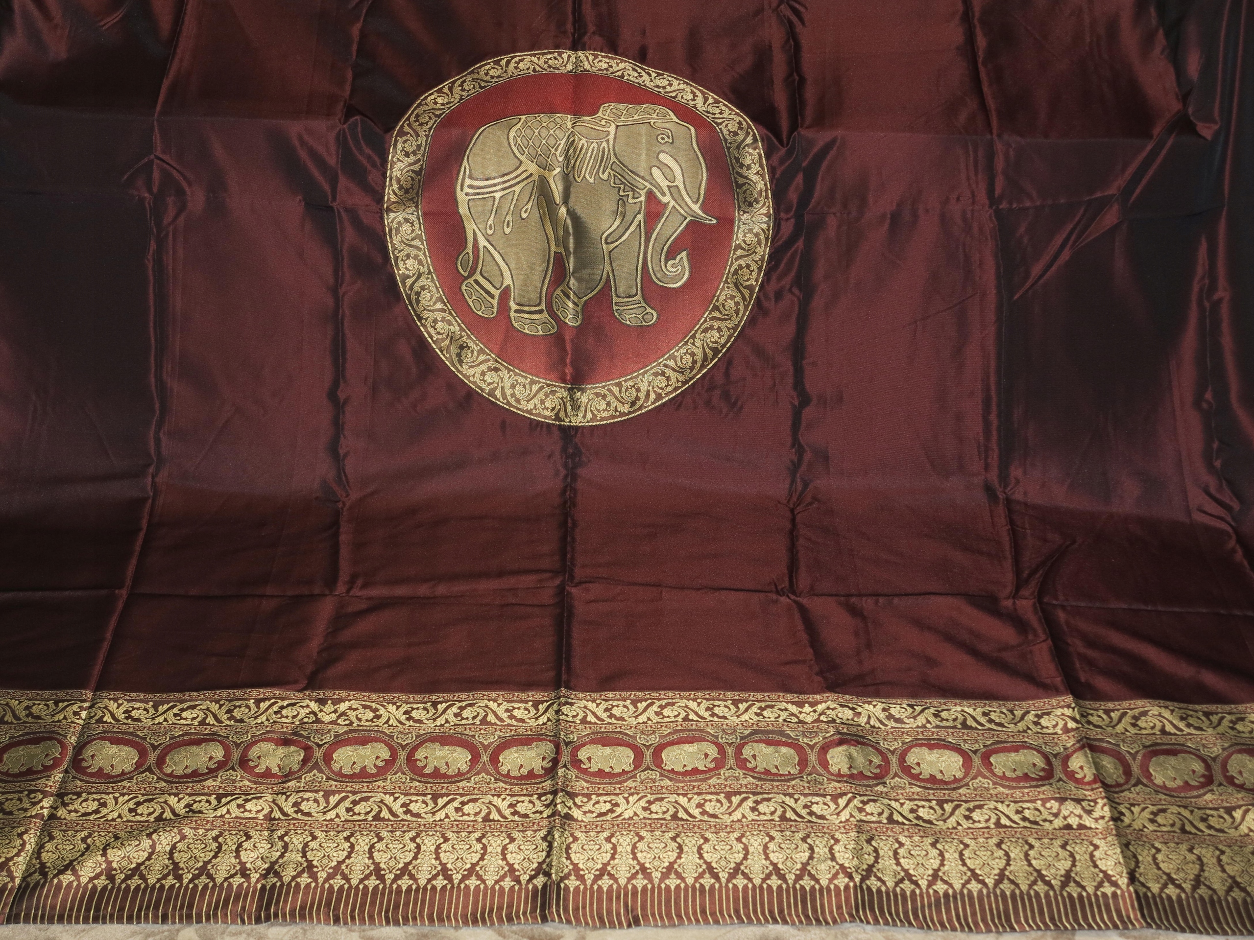 ОЧЕНЬ КРАСИВУЮ ИНДИЙСКУЮ СКАТЕРТЬ, КРЫШКУ С БОЛЬШИМ ЦЕНТРАЛЬНЫМ МЕДАЛЬОНОМ СО СЛОНОМ. СЛОНЫ ТАКЖЕ В ЭКСТРЕМАЛЬНЫХ ДИЗАЙНАХ. УКРАШЕНЫ КИСТОЧКАМИ ПО УГЛАМ