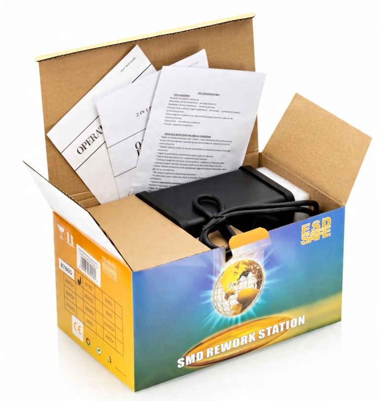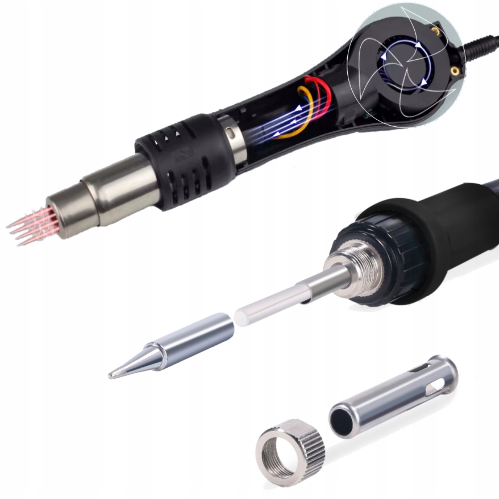 Паяльник, идущий в комплекте с устройством, может выполнять две задачи - паять электронные компоненты, в том числе: SMD, BGA, PLCC, QFP, OIC, т.е. выполнять функции традиционного паяльника или предварительное соединение пластиковых элементов (подробности в руководстве «Сварка пластика»)