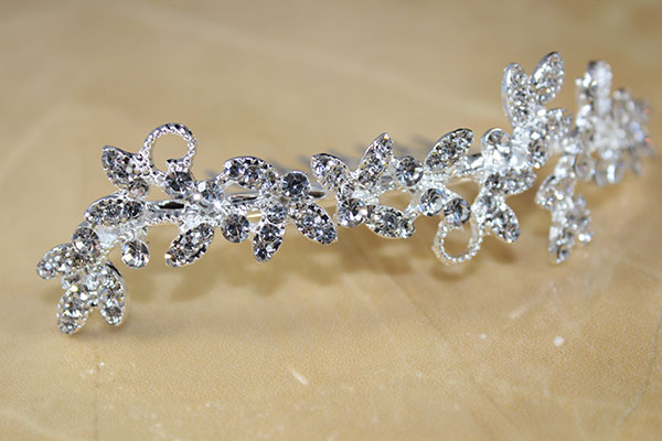 Ніжна діадема - весільний гребінець, прикрашений композицією із скручених у різні боки листя. Жорстку прикрасу не можна вільно згинати. Головний убір додасть шарму будь-якій зачісці. Коронка на гребінці тримається дуже добре. Стрази виблискують, як діаманти.
