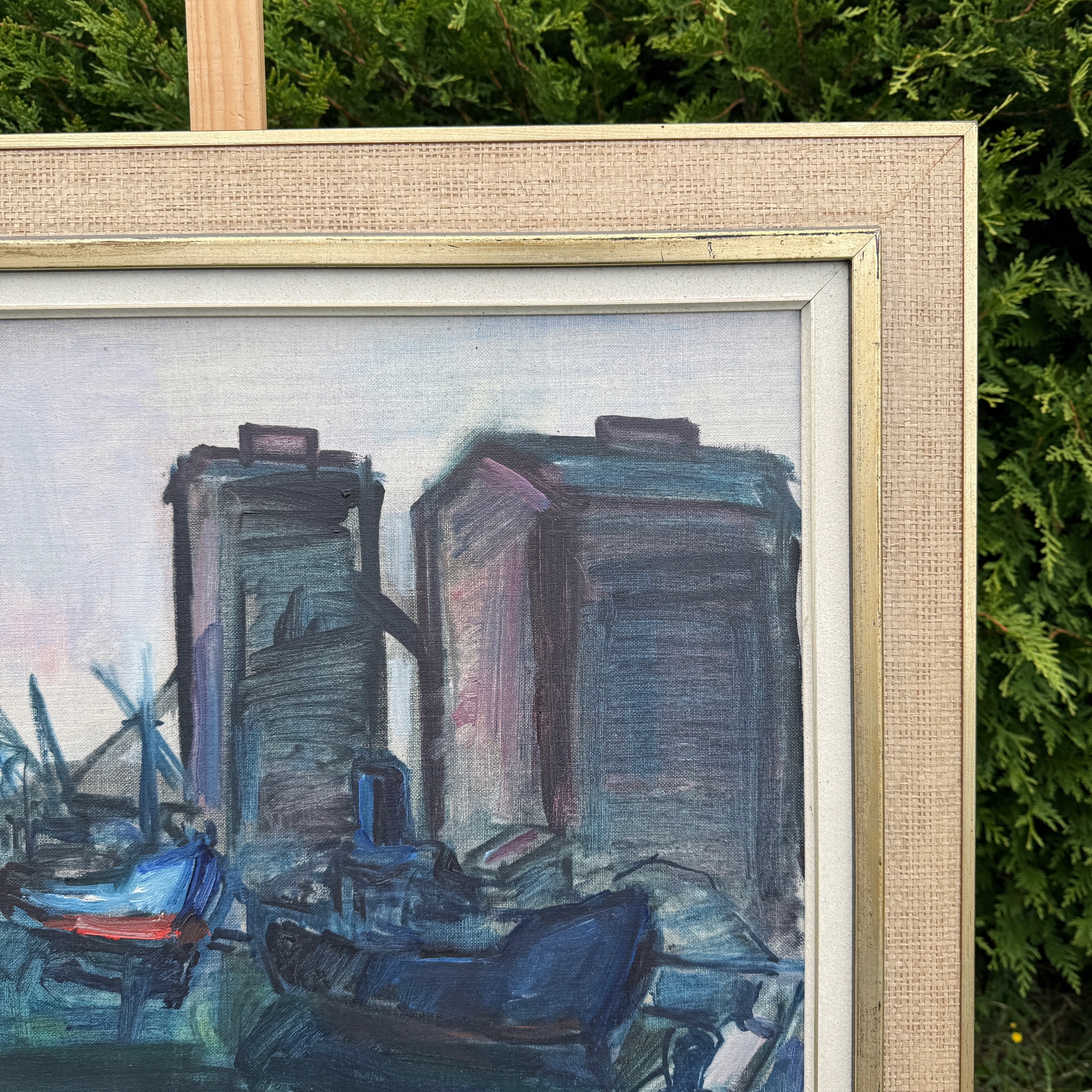 Тема картини - це порт -сцена з видимими кораблями, кранами та будівлями порту, ймовірно, силосом. Картина знаходиться в приглушених кольорах, з домінуючими відтінками синього та сірого кольору.