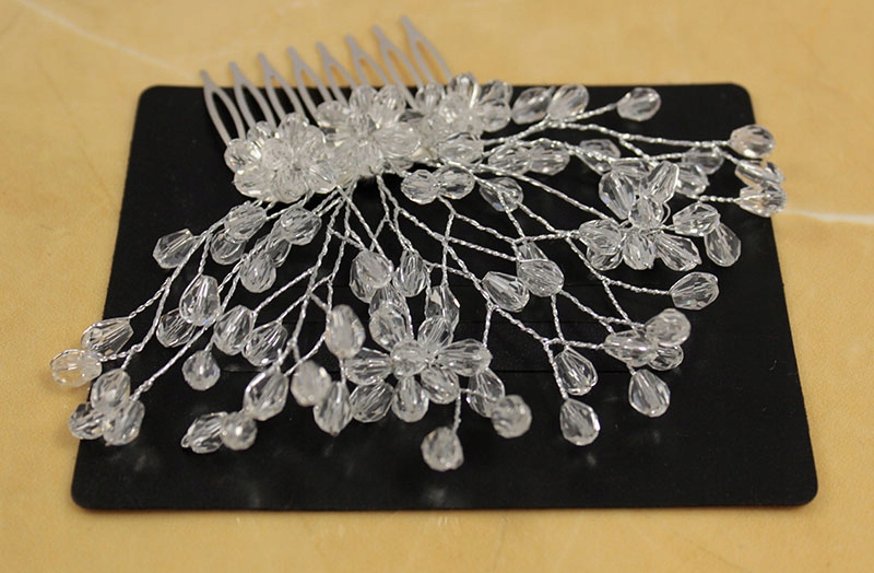 Весільна гребінець із застосуванням у формі квітів і гілочок з листям. Ціле висаджують кристалами. Гребінець - це плоска прикраса, як ми надсилаємо, але тичинки дозволяють згинати та вміститись у зачіску. Головний убір додасть чарівності кожній зачісці. Корона на гребінці залишається дуже добре.