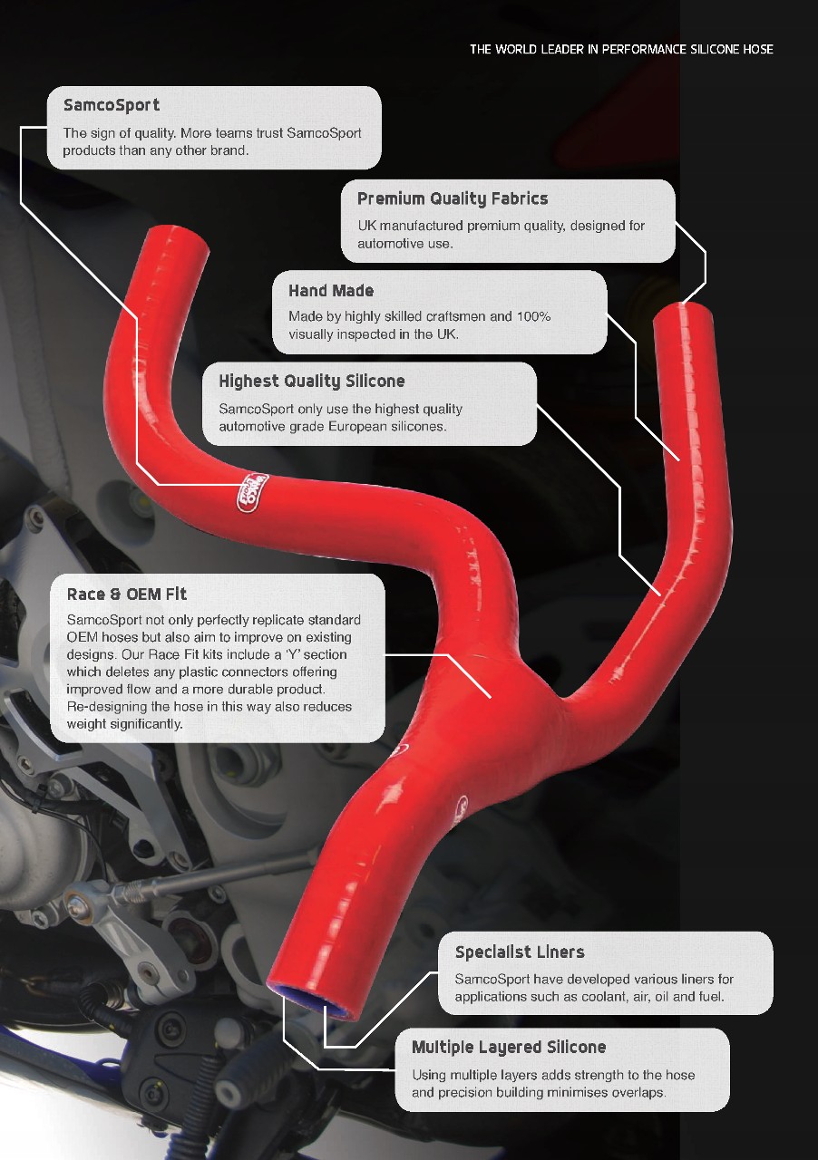 Шланги для мотоциклів Samco Sport забезпечують довший термін служби. і надзвичайна довговічність при високій температурі та високому тиску, особливо корисна в двигунах із сильним навантаженням. Вони використовуються багатьма найкращими командами Superbike, зокрема командою Colchester Kawasaki BSB, World Superbike BMW та іншими командами світового класу.
