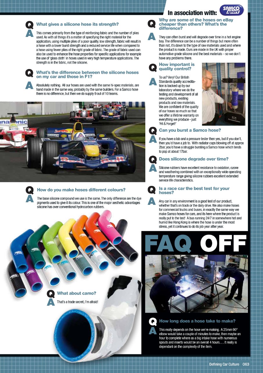 Samco Sport вже понад 10 років є світовим лідером у виробництві ефективних силіконових шлангів, постачаючи продукцію командам F1, NASCAR, WRC і WSBK. Асортимент комплектів шлангів і аксесуарів для перегонів неперевершений.