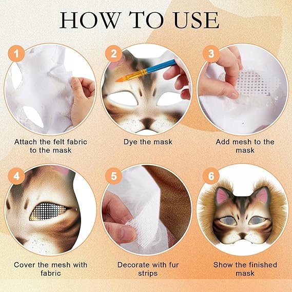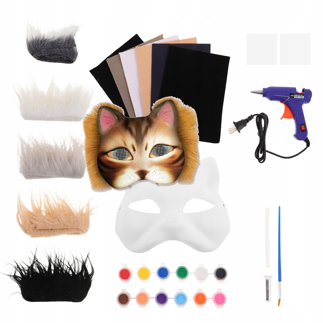 Створіть власну не стандартну кішку з хутром, сіткою, фетром та пістолетом для склеювання - ідеально підходить для Хеллоуїна, косплей або рукоділля! Що потрібно для створення власної унікальної маски для котів. Набір має порожню основу котячої маски, штучне хутро, пістолет для склеювання, фетри тканини та пластикова сітка. Добре для любителів речовин, цей набір дозволяє розробити та прикрасити спеціальну маску для косплей, подій чи мистецьких проектів.