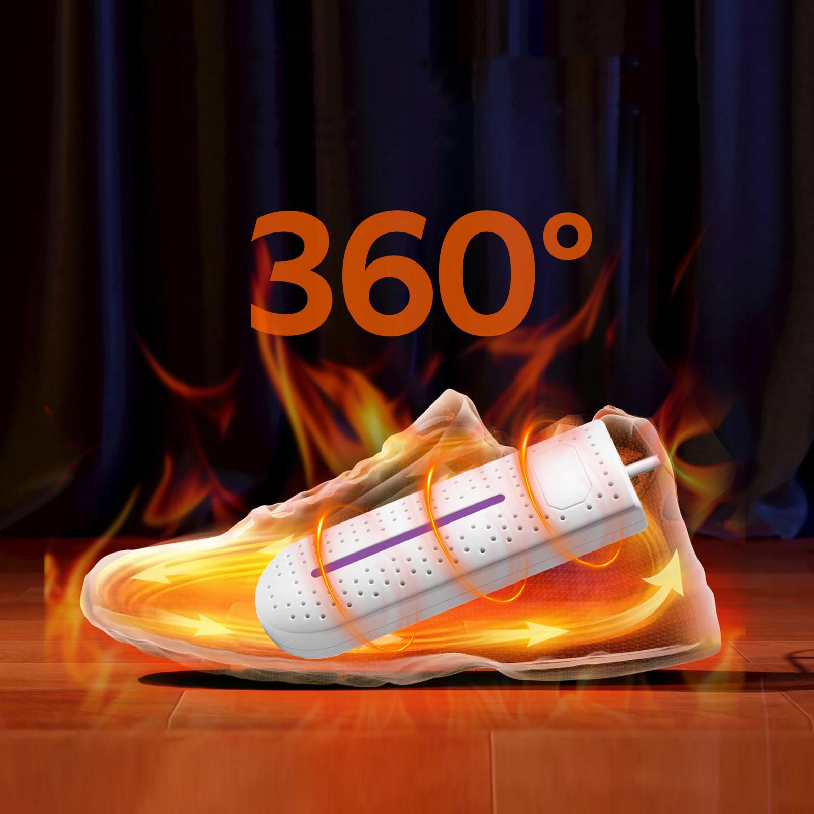 Багато отворів вентиляції густо розподілені на електричній сушарці. Після нагрівання всередині взуття створюється циркулюючий потік теплого повітря, який забезпечує навіть розподіл тепла на 360 ° та прискорює випаровування води. Електрична сушарка взуття також може включати як єдиний, так і верхній матеріал, і навіть рівномірно сухий у мертвих областях.