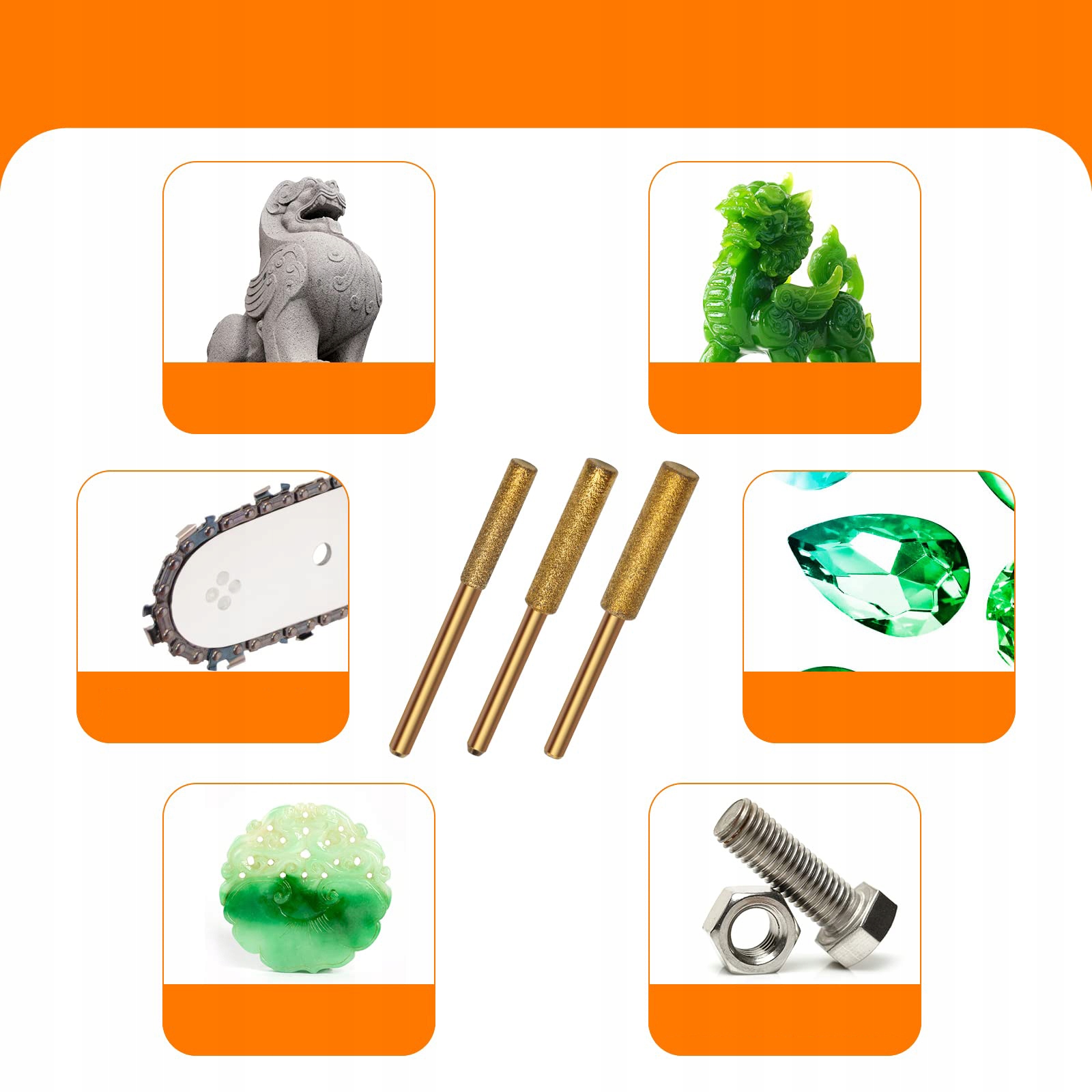 ✔ набір файлів з 3 -мм кріпленням - для кожної викрутки/свердловин, призначених для заточення ланцюга. Завдяки цьому, заточування ланцюга стає швидким та ефективним, що значно покращує комфорт роботи. Це відмінна альтернатива ручним файлам та заточувачам.