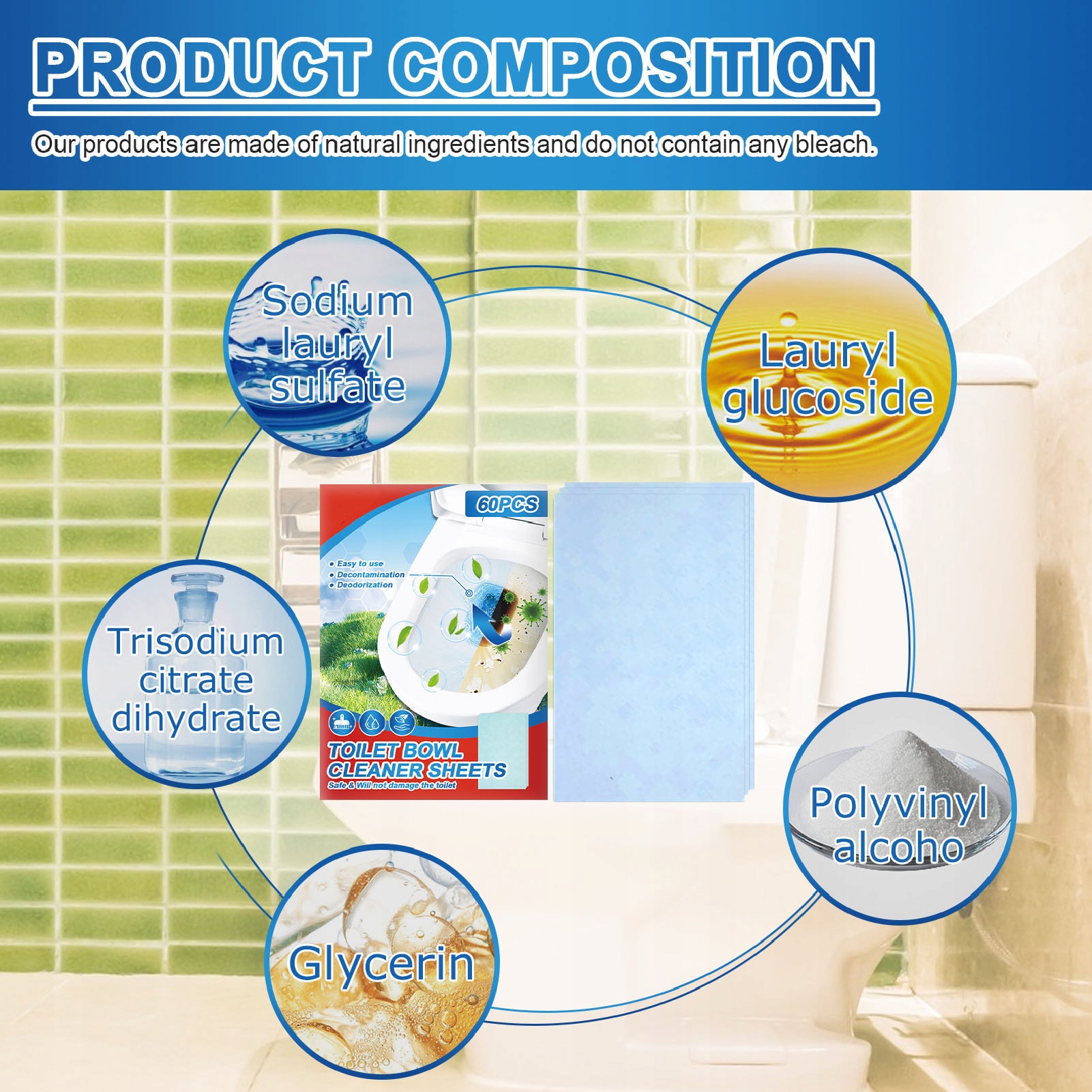 3. Універсальне використання: Листи для чищення туалету підходять для туалетів, азіенеку та зад. Кожен пакет містить 180 шматочків таблеток для чищення туалету, забезпечуючи очищення та обслуговування туалету.