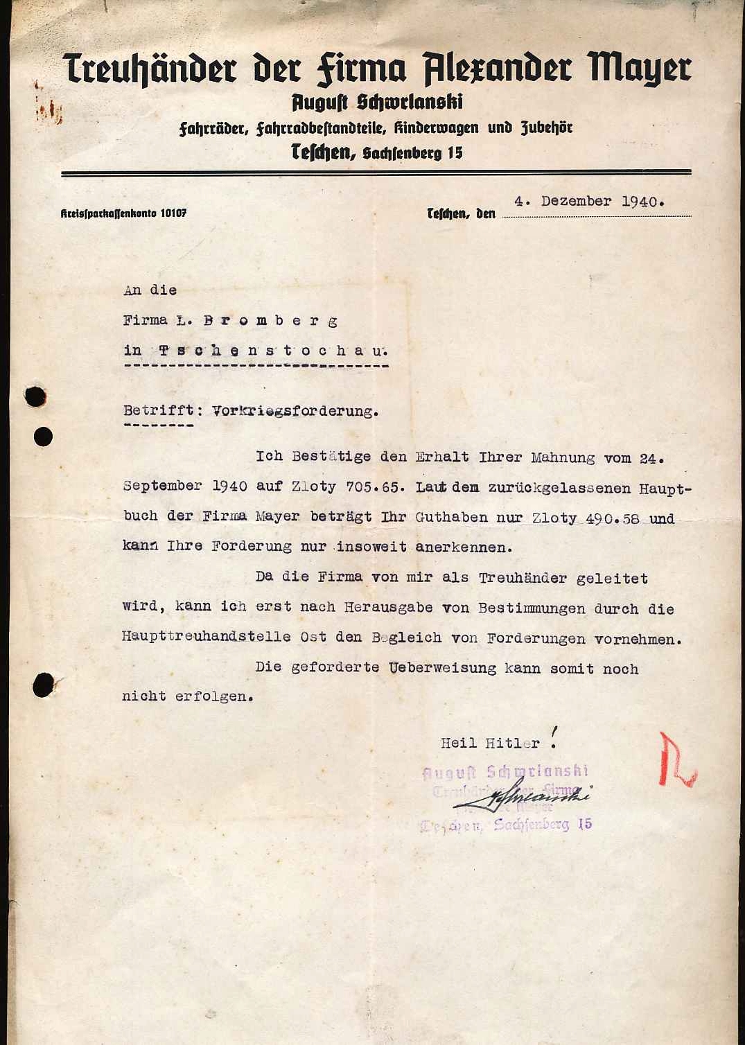 1940 II СШ, лист ФІРМА ОЛЕКСАНДР МАЙЄР АВГУСТ ШВРЛАНСЬКИЙ, ЦЕШИН.