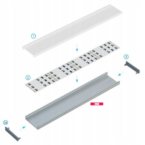 Схема складання елементів системи освітлення з використанням профілю SOLIS і (1) ШИРОКОГО абажура, (2) трьох світлодіодних стрічок, (3) цоколя без отвору, (3а) цоколя з отвором p>