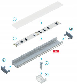 Схема монтажу елементів освітлювальної системи з використанням D профілю та (1) абажура BASIC, (2) світлодіодної стрічки, (3) ковпачка з отвором, (3а) ковпачка без отвору, (4) кріпильного гвинта , (5) монтажний кронштейн D MINI