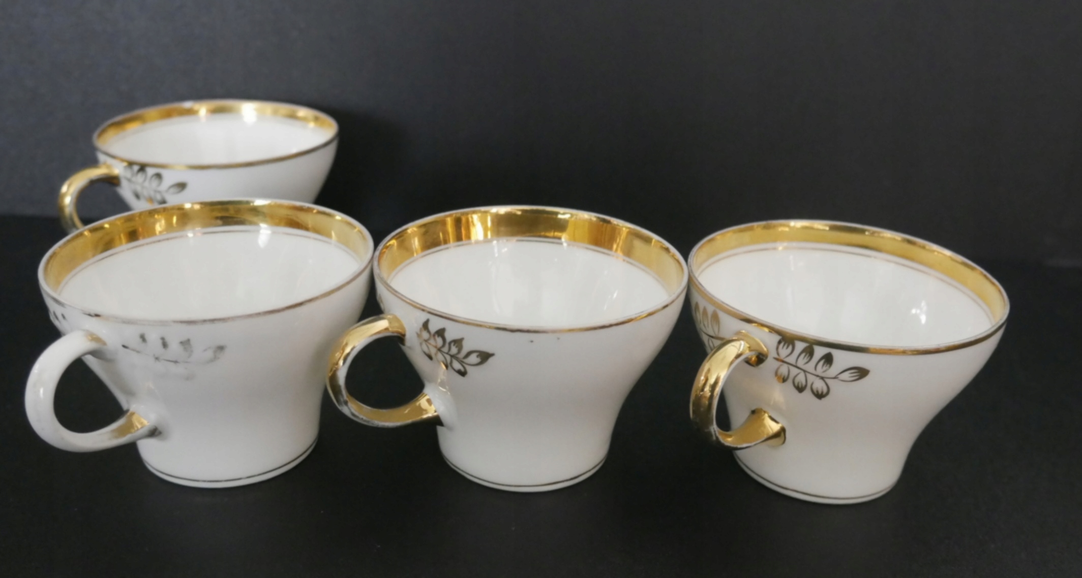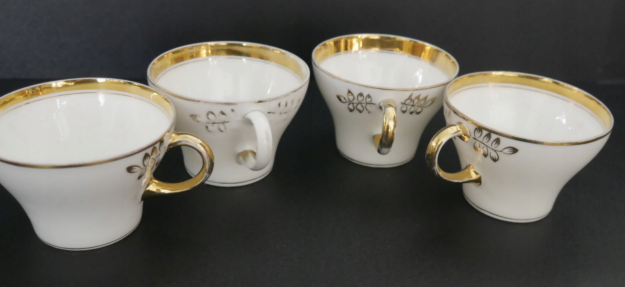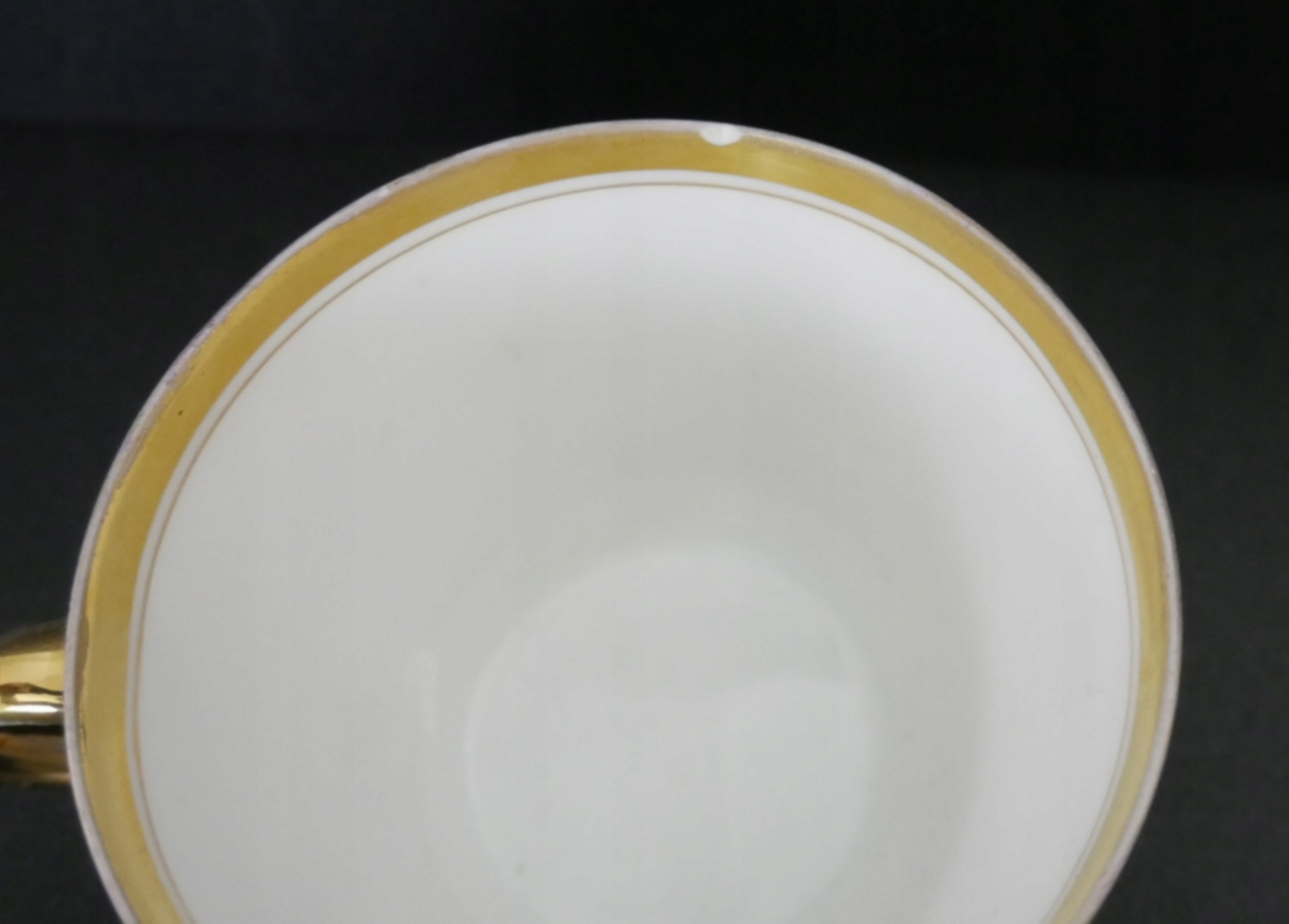 1 чашка має скол, 1 значне потертість позолоти, 1 чашка класифікована як хороша, має нерівності на обідку, незначне потовщення - фабричне виготовлення