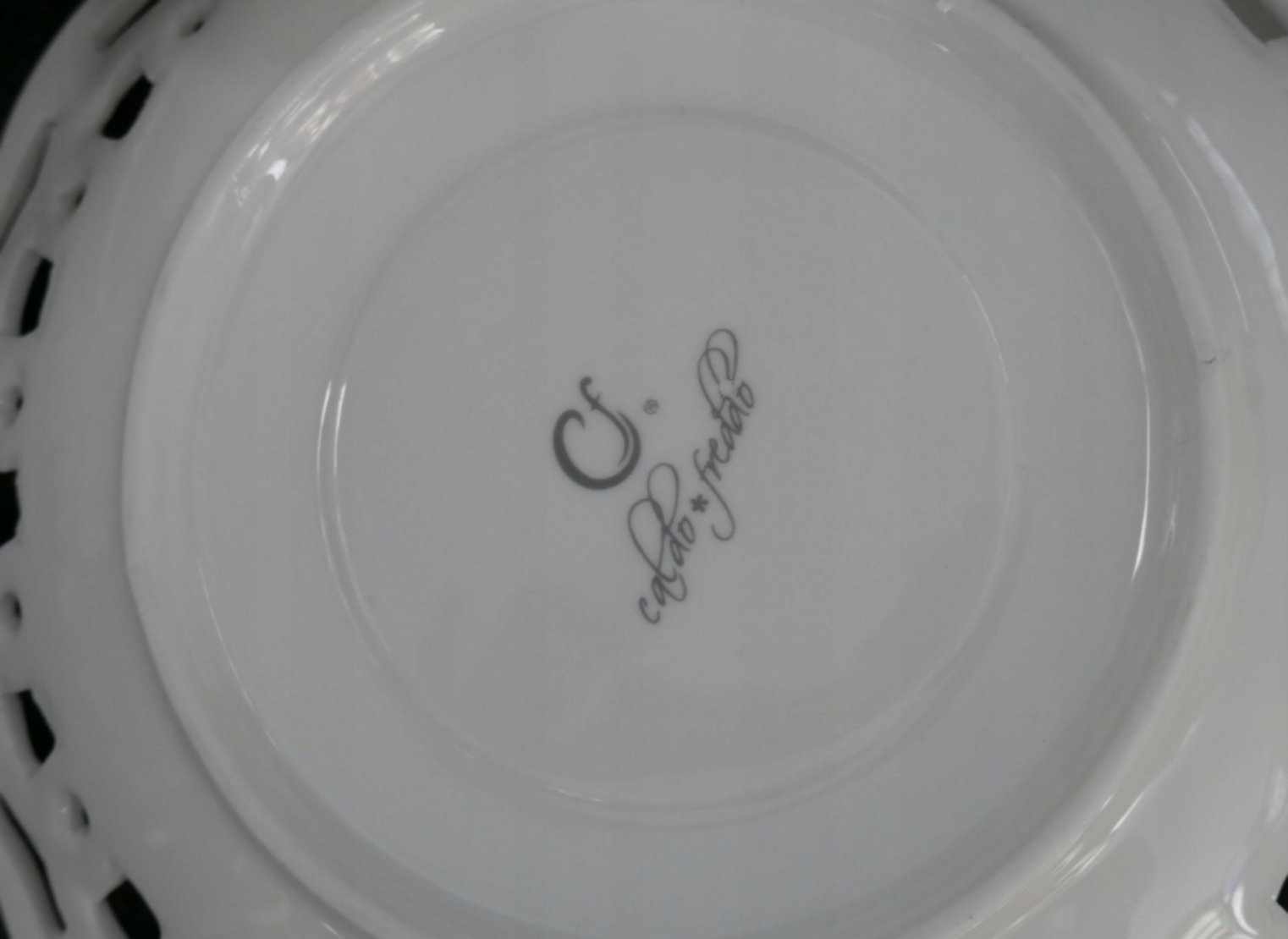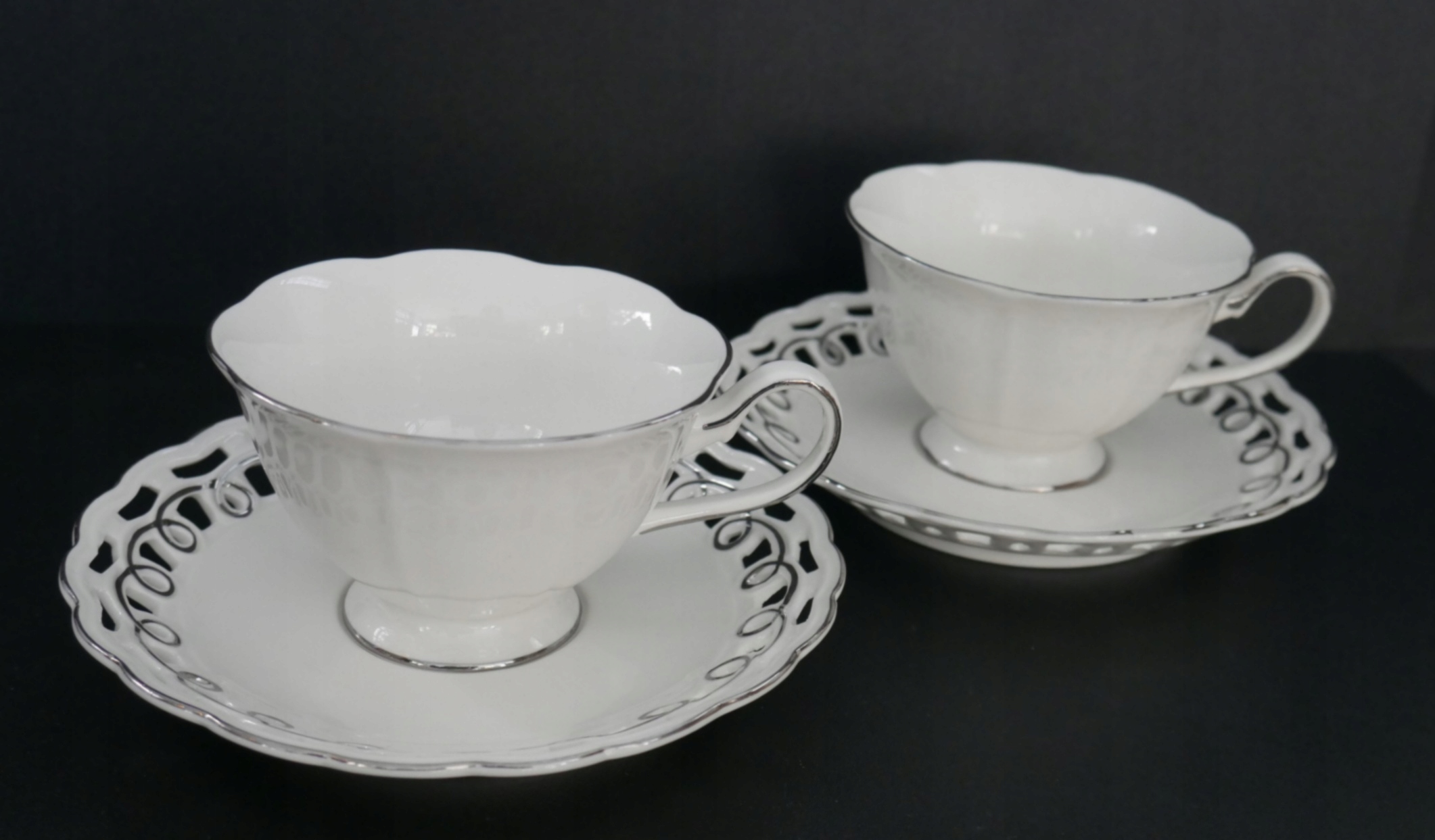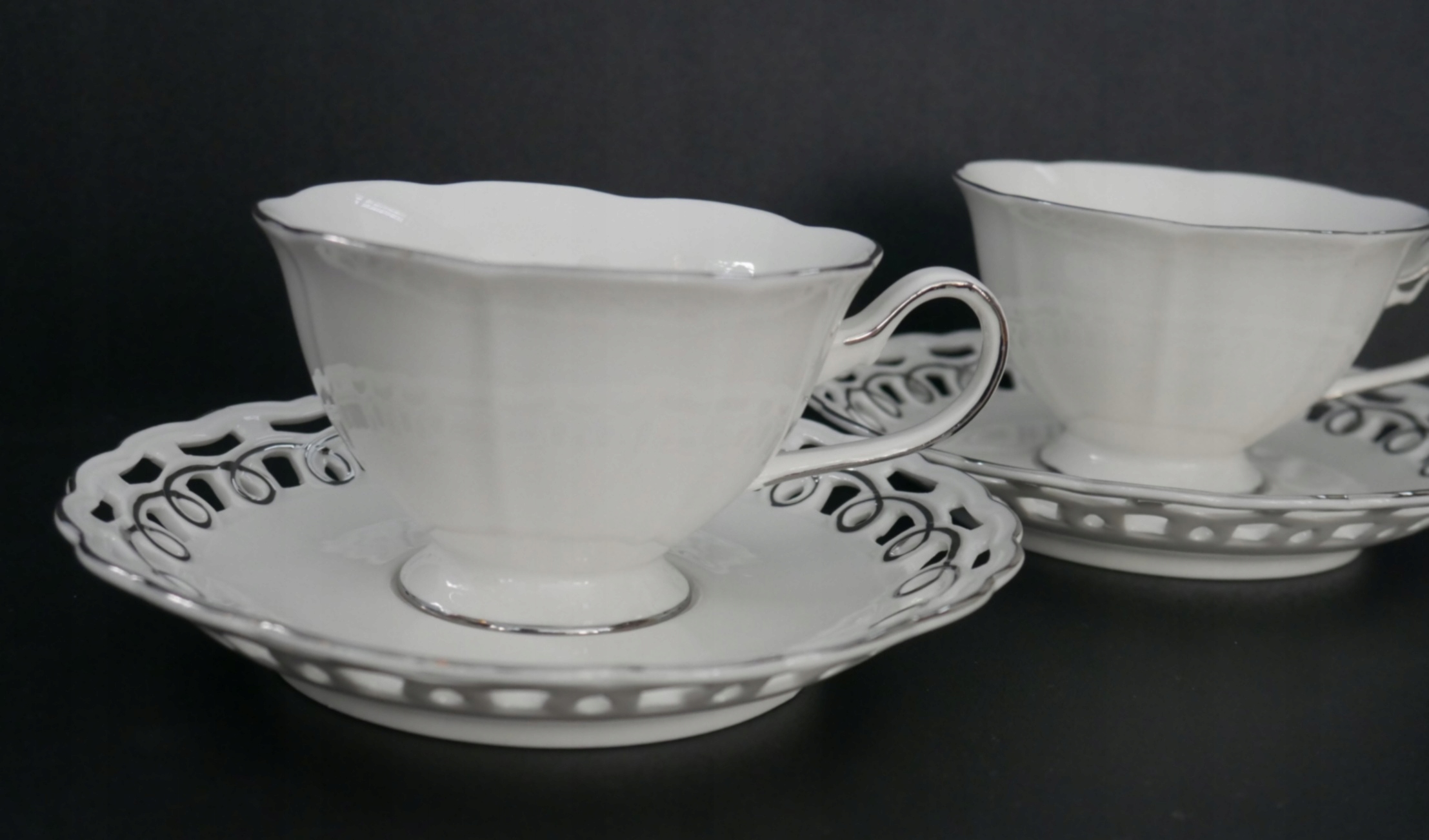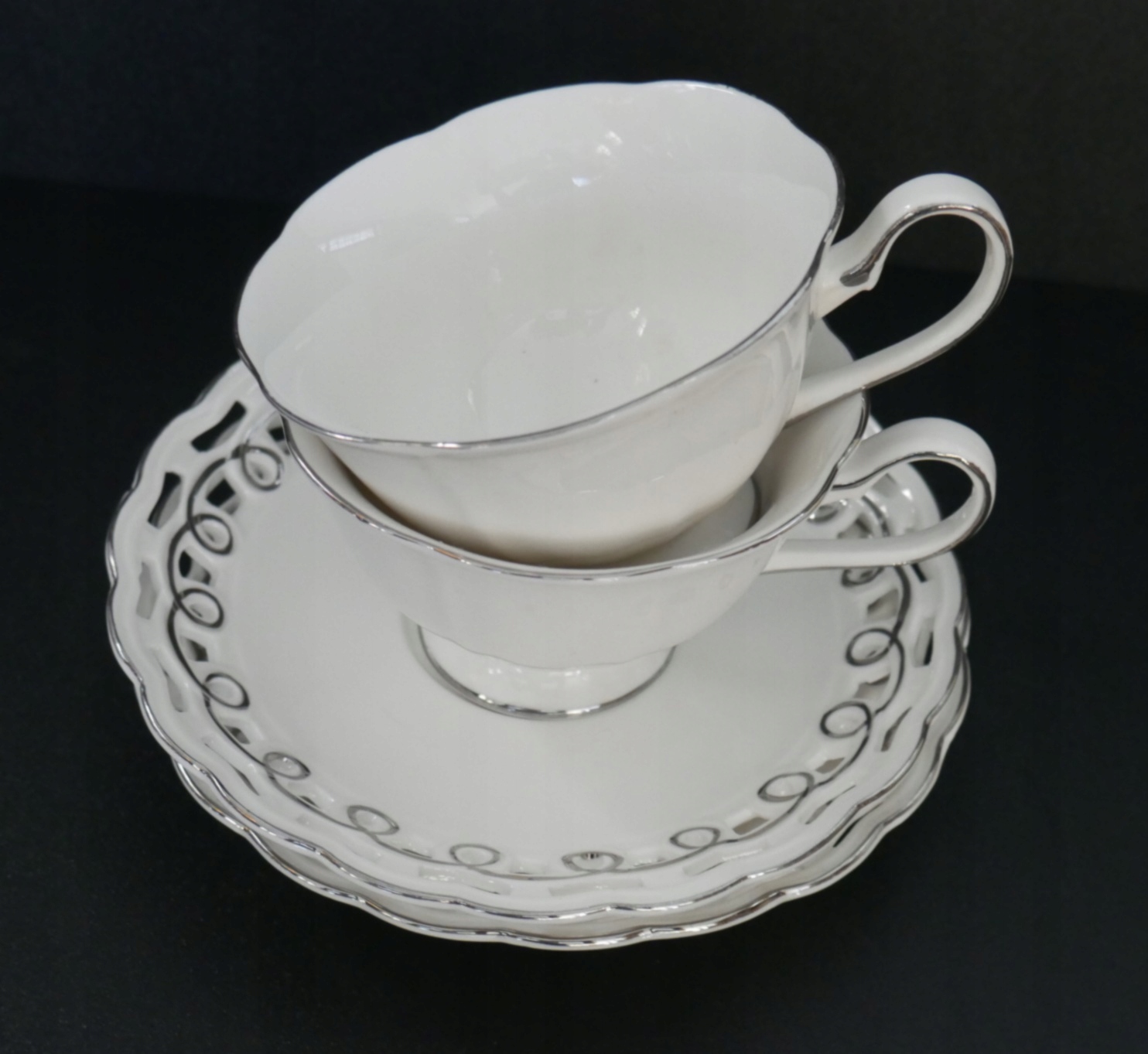 біла порцеляна, ніжний відтінок "кістка", нове покоління, товстостінні, обідок сріблястий, ажур по обідку тарілок