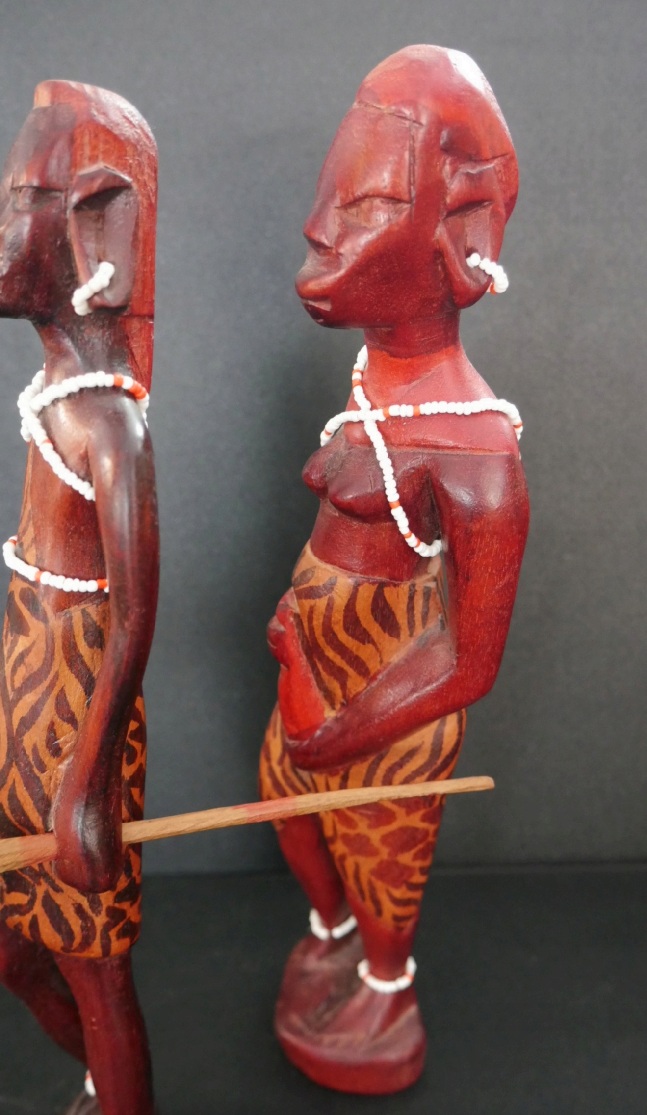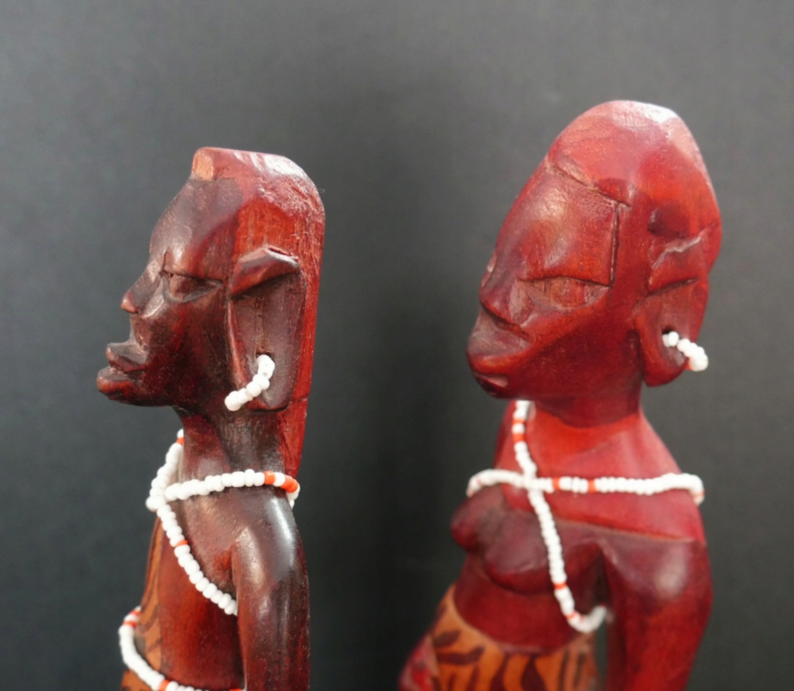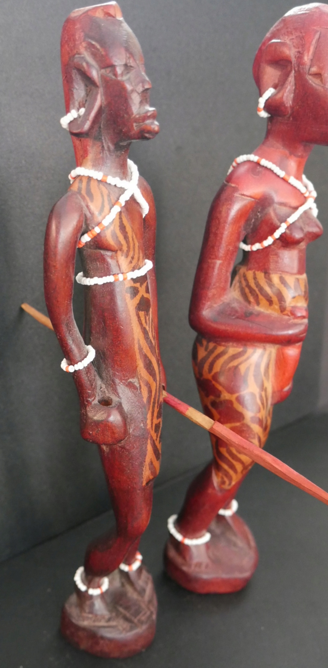 2 Wooden figurines, members of the tribe -woman and man, hand -made, decorated with small beads