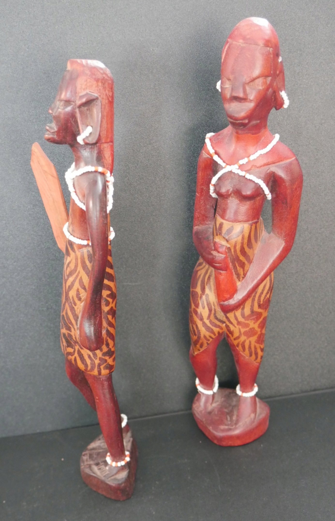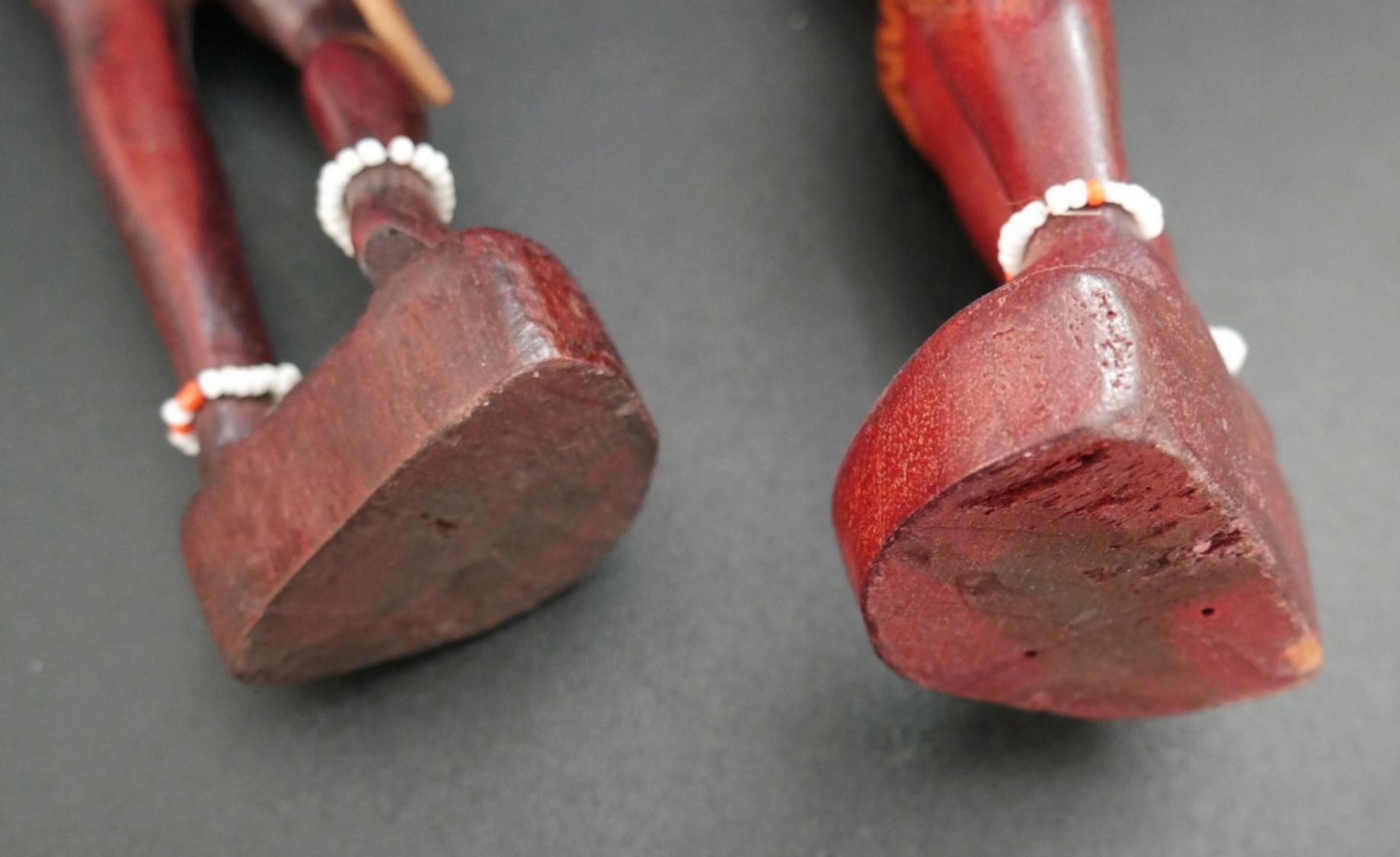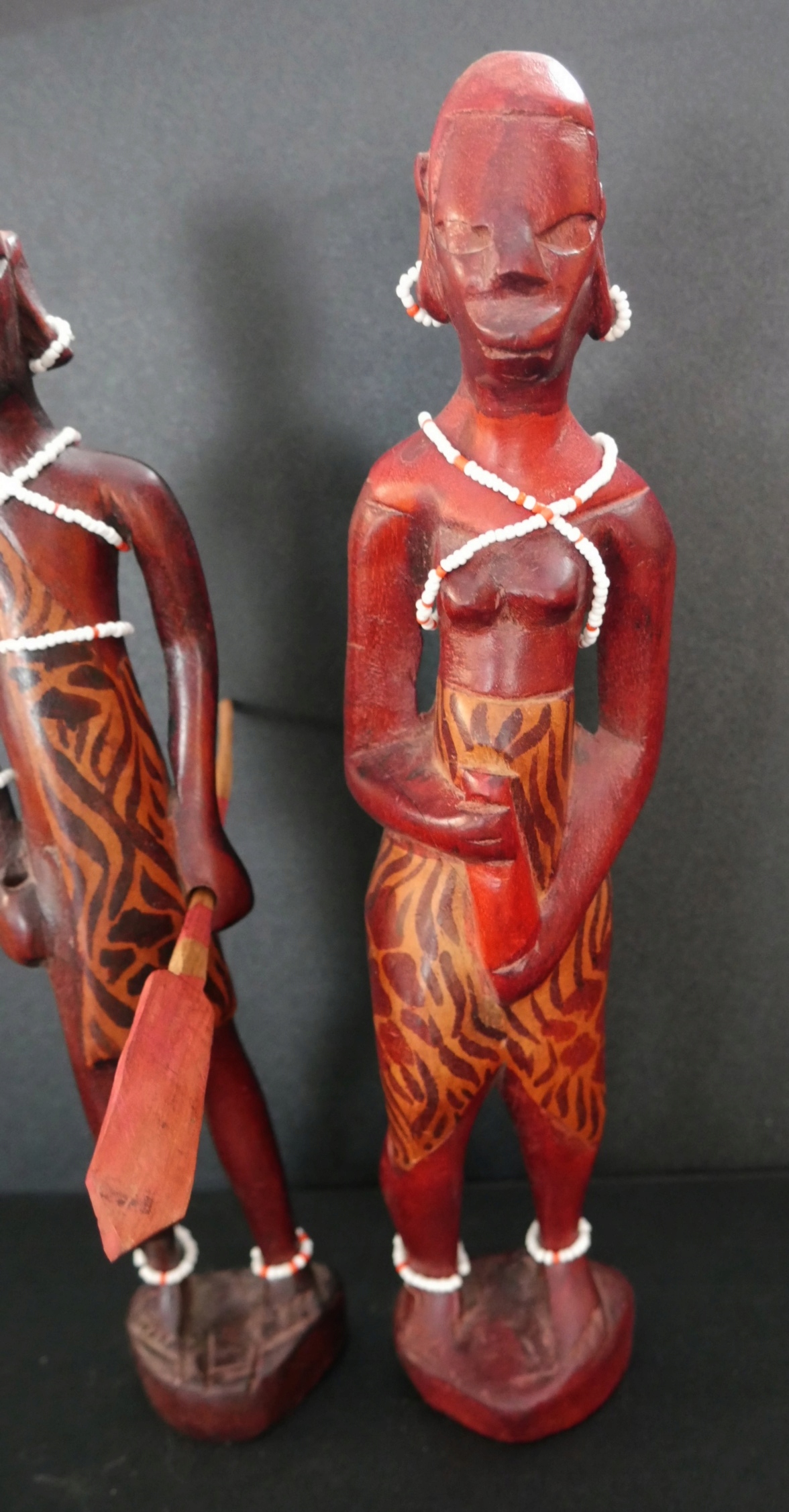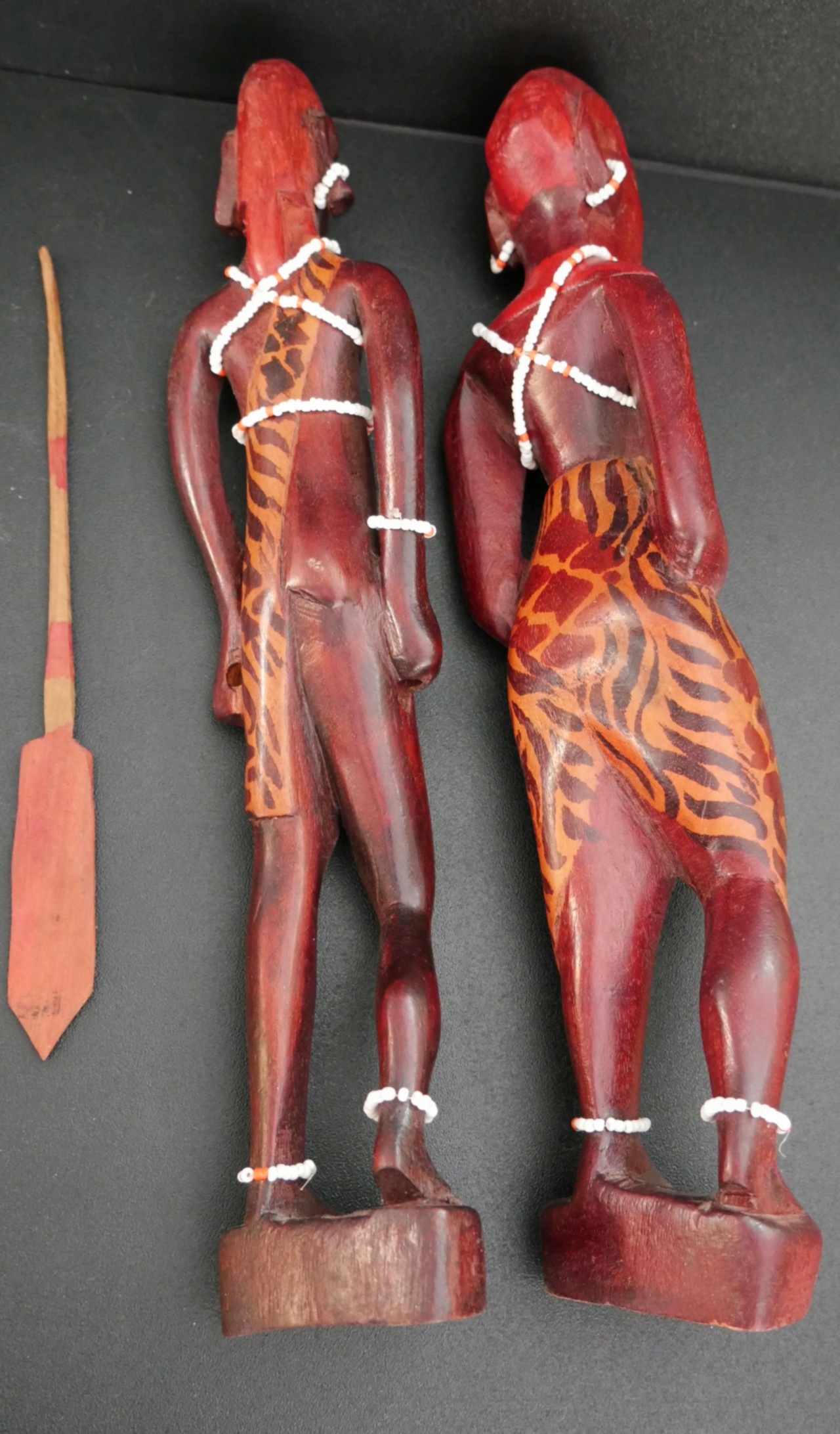 2 Wooden figurines, members of the tribe -woman and man, hand -made, decorated with small beads