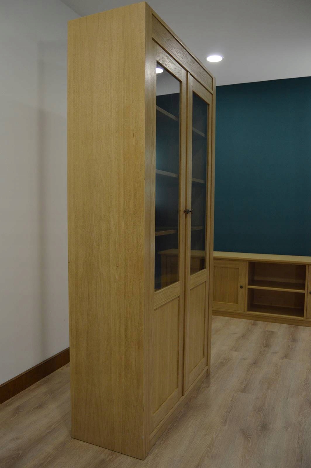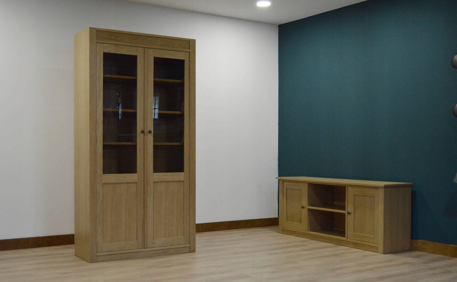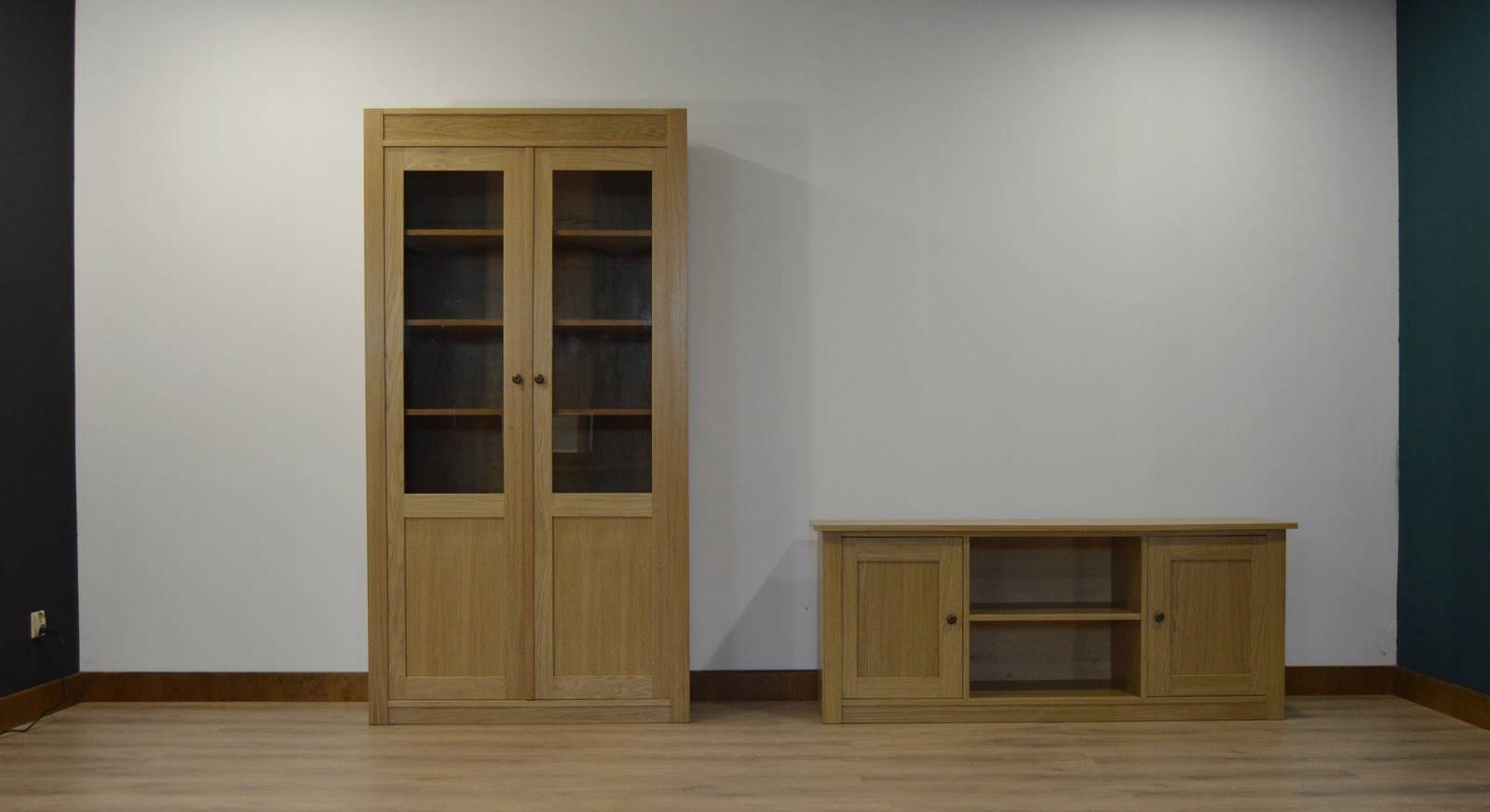 Цілком з дерева, з дерев'яних меблевих щитів. Середина дошки виготовлена з деревини сосни, облицьована з двох сторін дубовим шпоном. Шарнірні петлі, невидимі.