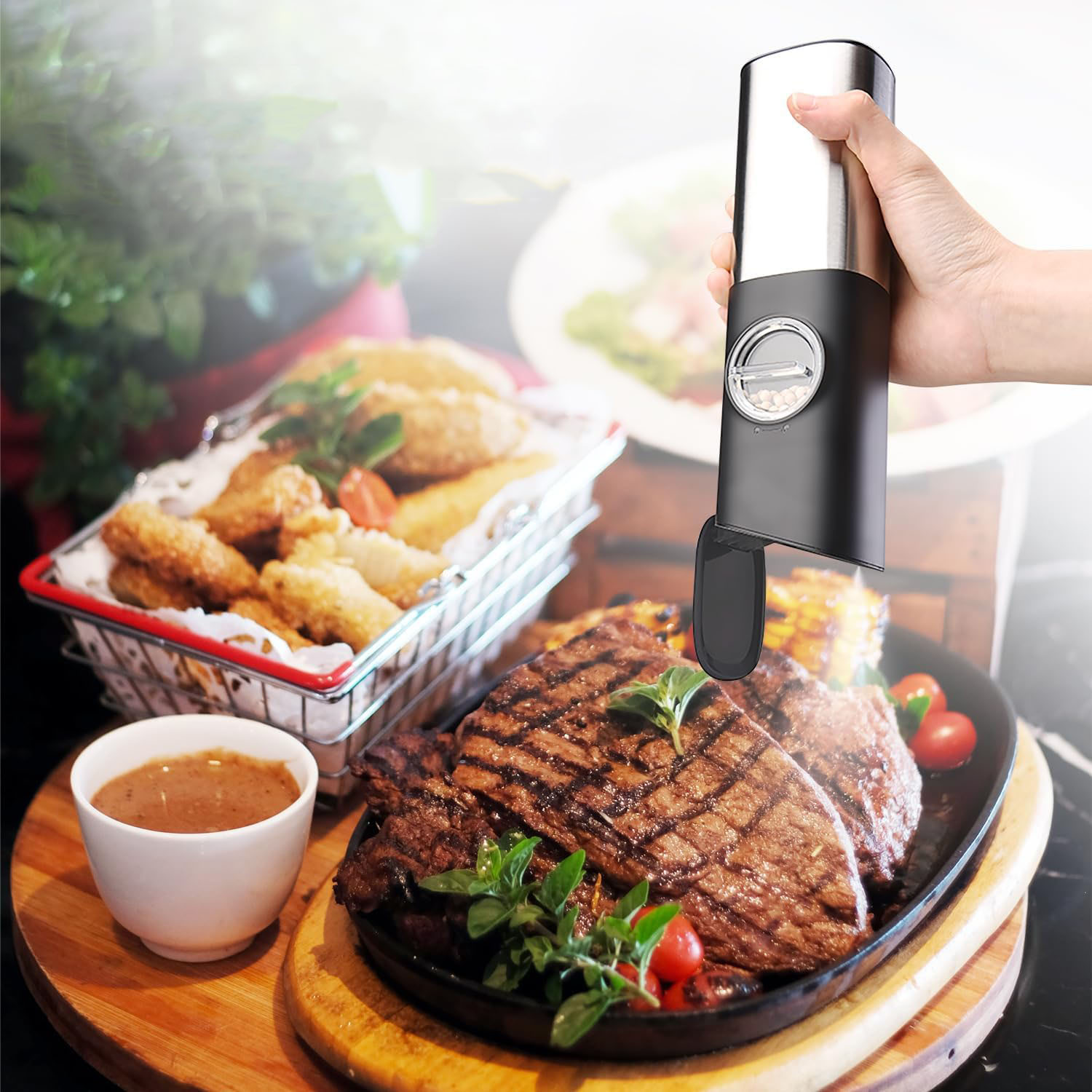 -світлодіодне світло вмикається автоматично після запуску. Він чітко висвітлює їжу та забезпечує точну приправу. Світлодіодне світло залишається ввімкненим під час зарядки та вимкнення після повного заряду.