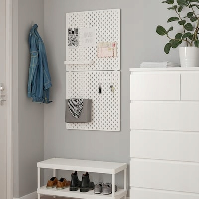 SKÅDIS SKÅDIS з’єднувач для пегборда – білий – це практичний аксесуар, який дозволяє легко з’єднати дві щитки SKÅDIS, забезпечуючи додатковий простір для зберігання. Завдяки цьому рішенню ви можете повісити дві дошки вертикально без необхідності свердлити додаткові отвори в стіні.