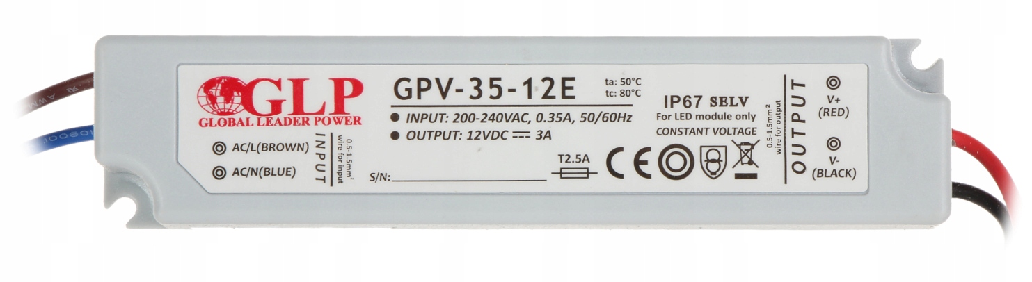 Блок живлення з листом "e" від його імені призначений для європейського ринку. Він має менший діапазон вхідної напруги, менший і легший порівняно з джерелом живлення GPV-35-12.