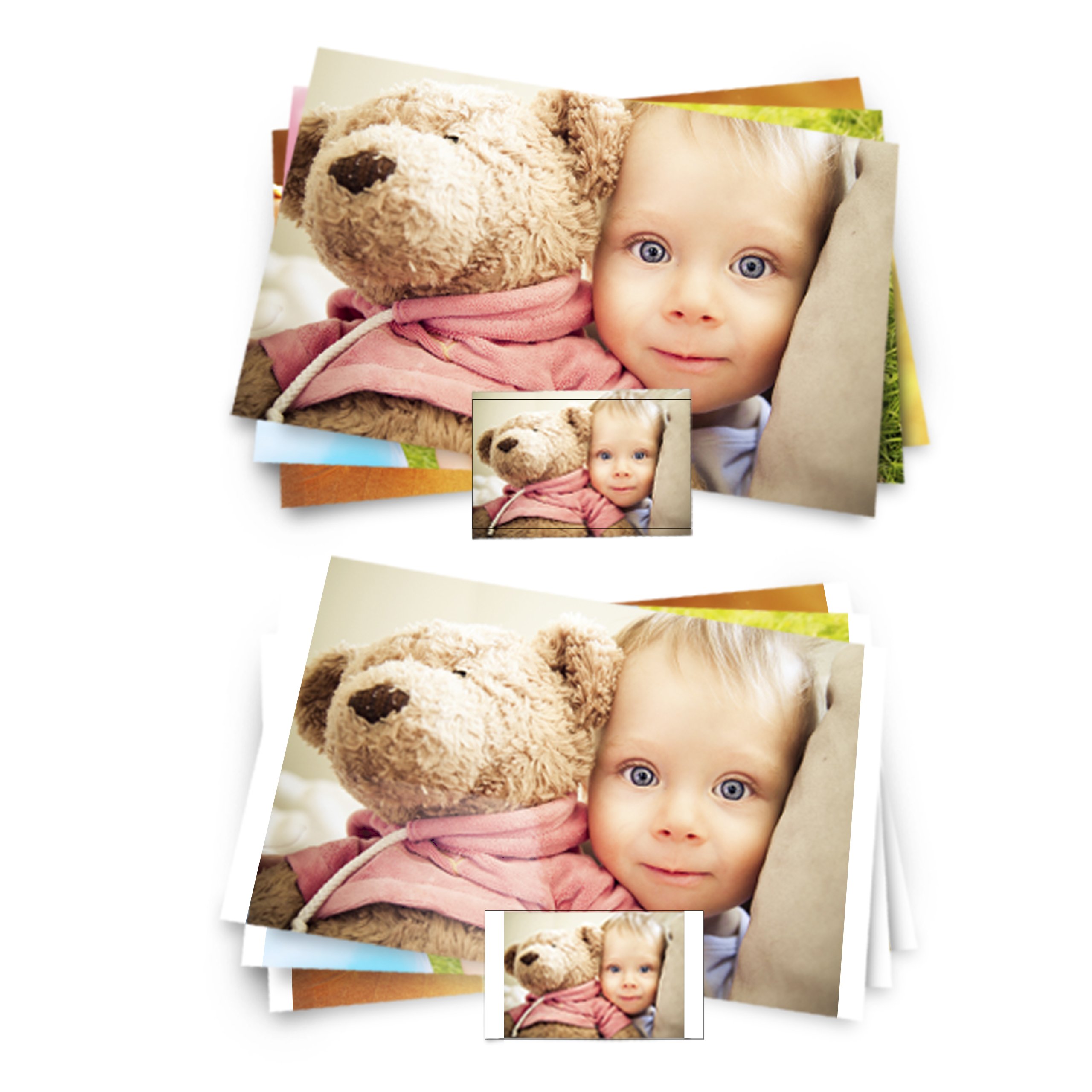 Вашу фотографію буде обрізано, як у варіанті "без рамки", із доданою білою рамкою навколо неї.