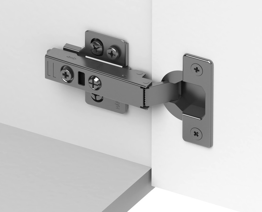 Metalla + E Hafele може бути призначений для застосованих дверей. Кут відкриття шарніра - 110 °. Він має інтегроване гальмо, заховане в шарнірі, що забезпечує тихе і делікатне закриття дверей. Налаштування, висота та глибина сторони дозволяють правильно відрегулювати шарнір під час складання, а використання направляючого кліпу робить передню частину та розбирання. mm