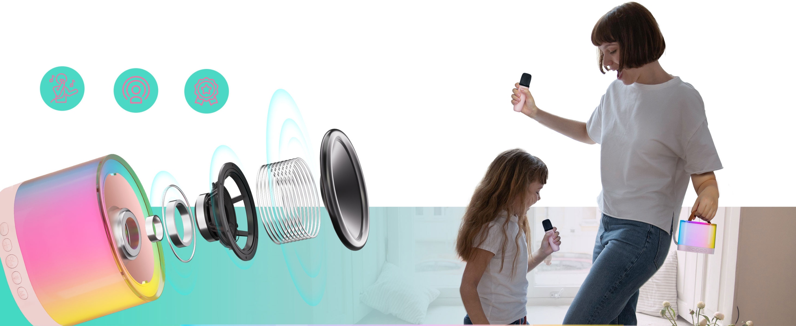 🎤 , оснащений двома мікрофонами , дозволяє насолоджуватися співом з родиною та друзями. Bluetooth забезпечує швидке випаровування та стабільну передачу на більші відстані.