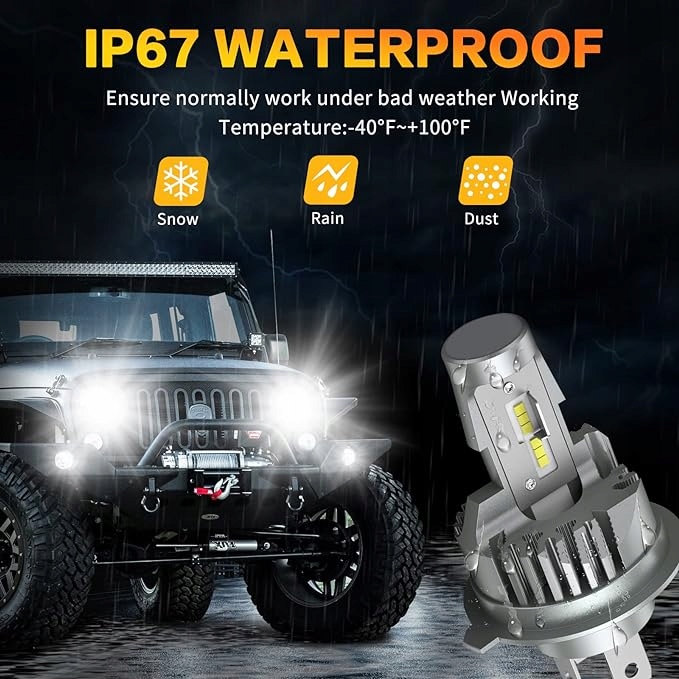 - H4 кузова фари, повністю виготовлене з алюмінію повітря, швидкого розсіювання тепла та відсутності шуму вентилятора, швидко та ефективно розповсюджувати тепло, що утворюється світлодіодними мікросхемами та складати стабільну лампочку та до 50 000 годин. 4 Вам не потрібно турбуватися про невдачу під час екстремальних погодних умов.