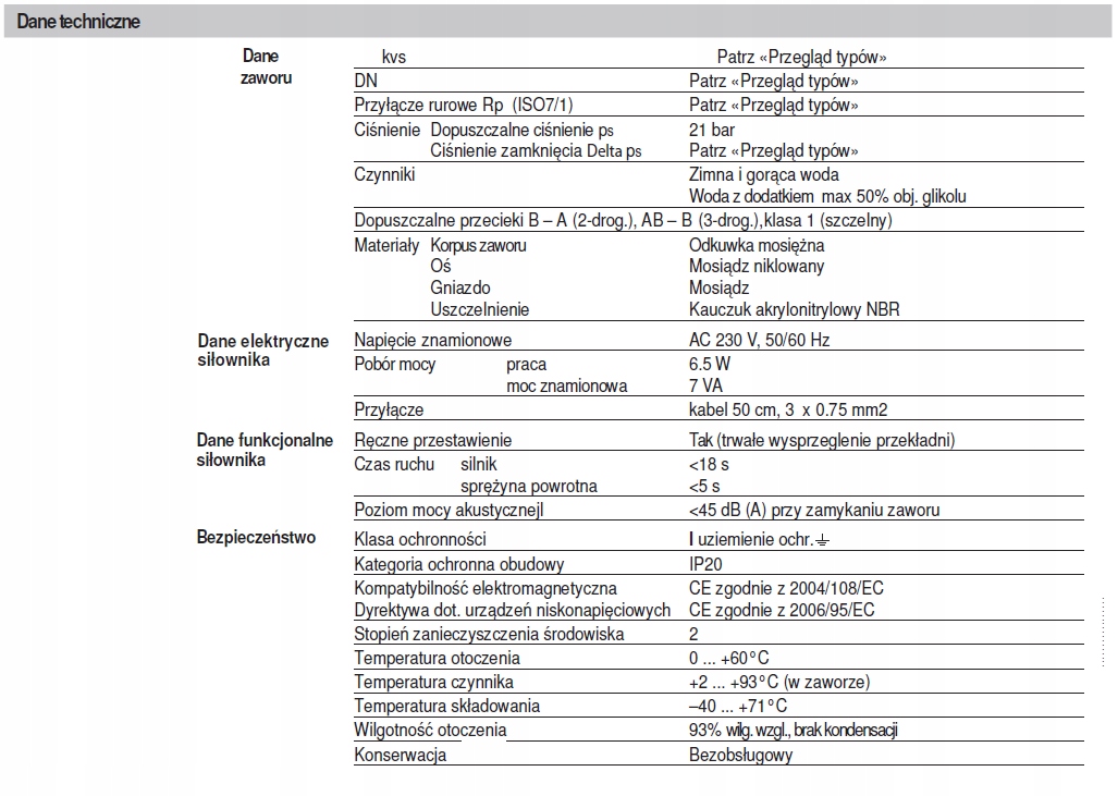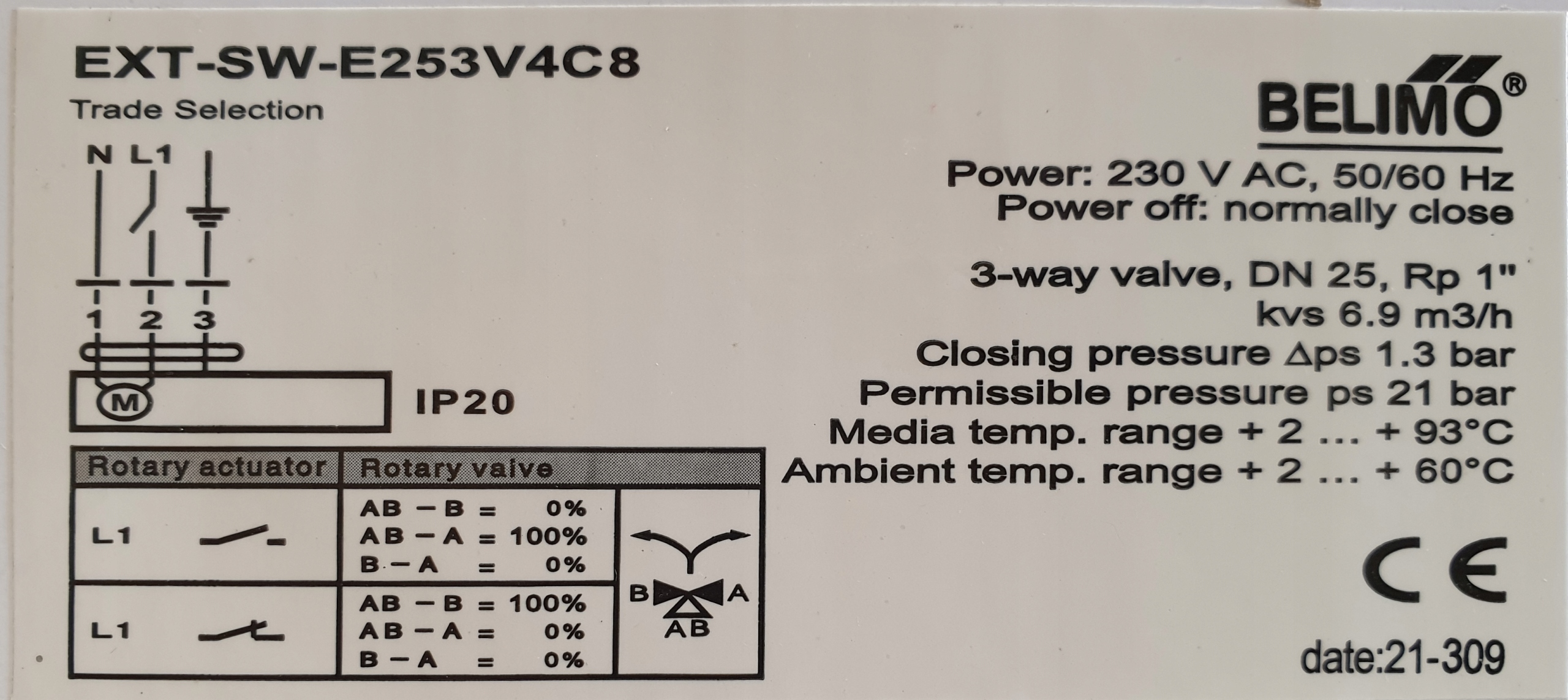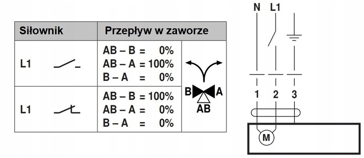 Клапан поставляється з приводом. Він працює за принципом перемикання між ланцюгами AB-A (нормальне положення клапана) і AB-B. Коли на привод подається живлення 230 В, клапан встановлюється в положення AB-B і весь потік направляється в цей контур. У разі відключення електроенергії поворотна пружина в приводі втягує клапан і встановлює положення АВ-А, при якому весь потік направляється на вихід А. Схема електричного підключення та схема положення клапана в залежності від Сигнал керування 230 В на контакті L1 показано нижче.