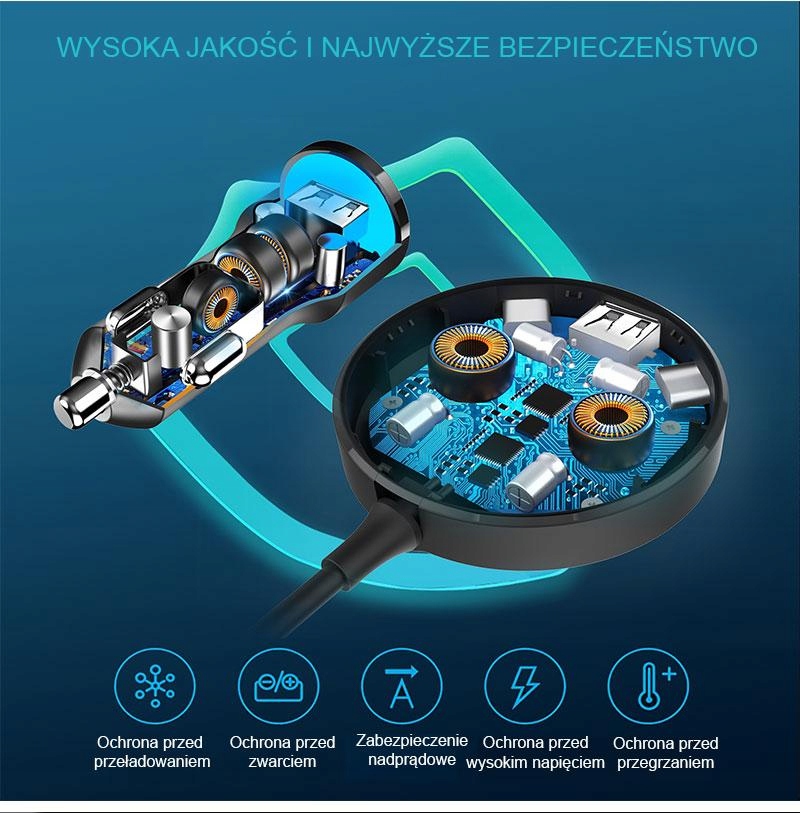 зарядному пристрої, оснащеному аж 5 розетками, що підтримують системи швидкої зарядки, - це зручність під час подорожі на машині. , довгий кабель до 1, 5 м дозволяє надати зарядні порти пасажирам на задньому дивані.
