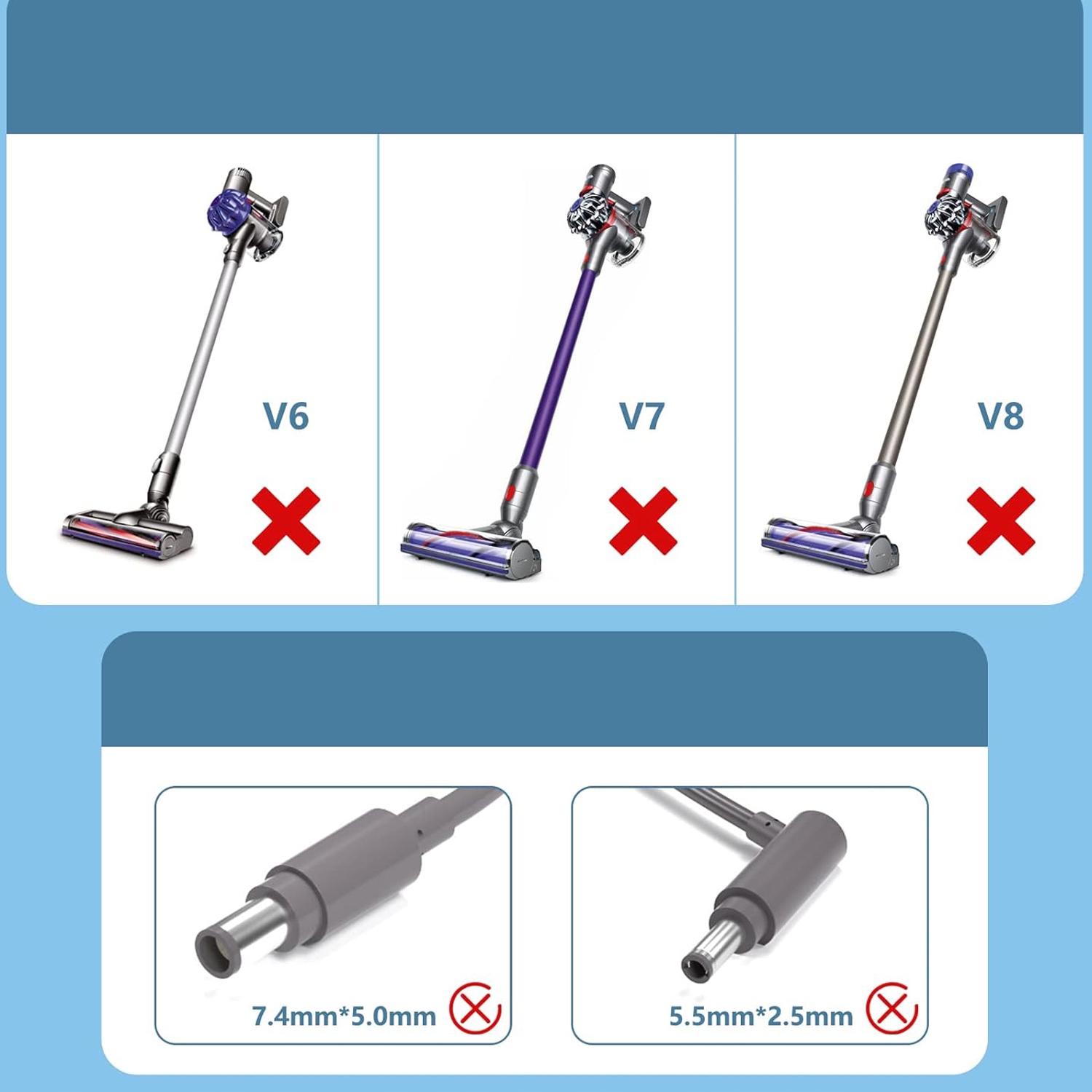 - Набір зарядних пристроїв, сумісних з вакуумними очищувачами Dyson: підходить для вакуумного очищувача Dyson V10 V11 V12 V12 V15 SV12 SV12 SV14 SV15 SV20 SV22 , це не є сумісним з іншими моделями. Тепле нагадування: Перед покупкою перевірте модель пилососа, форму вилки та стан акумулятора вакуумного очищувача. Переконайтесь, що пробка між зарядним пристроєм та пилососним очищувачем такий же, як і вихідний навантажувач PLAGIN, щоб уникнути його використання.