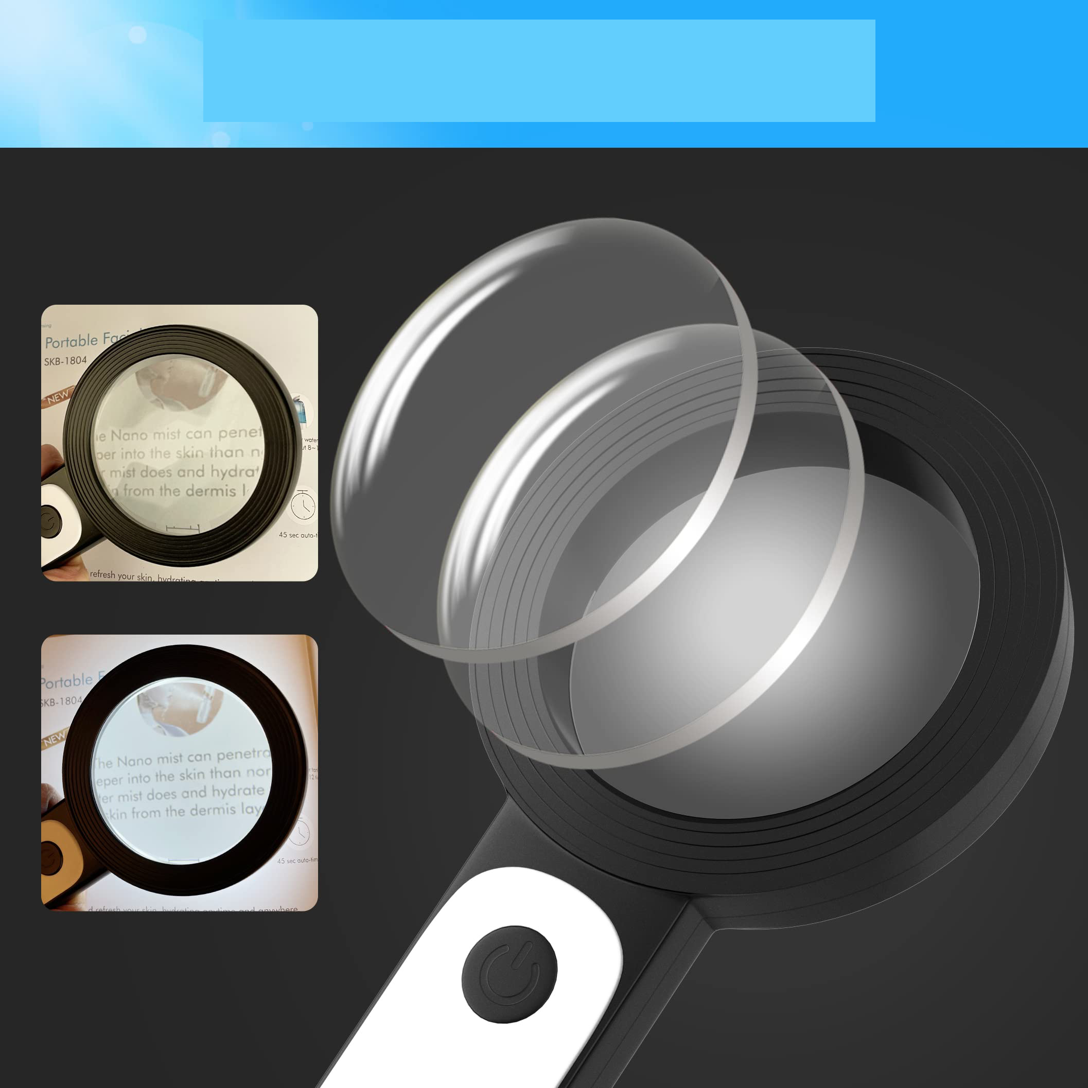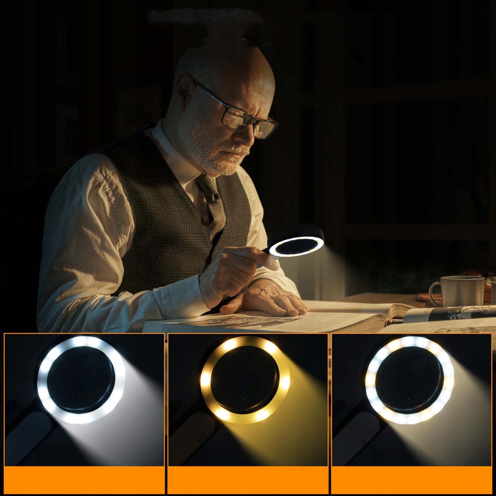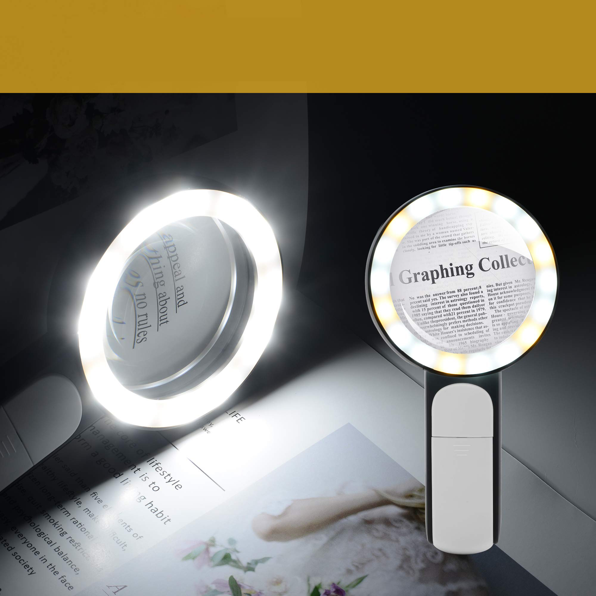 побудована енергія -18 світлодіодів забезпечує додаткове освітлення для забезпечення загального кращого досвіду, читаючи навіть вночі або в темних місцях. 3 Режими освітлення (холодний, теплий і змішаний) можна переключити на основі різних умов освітлення, що може зменшити втому зору, що дуже корисно для людей з дегенерацією макули або далекозорій/фейопією.