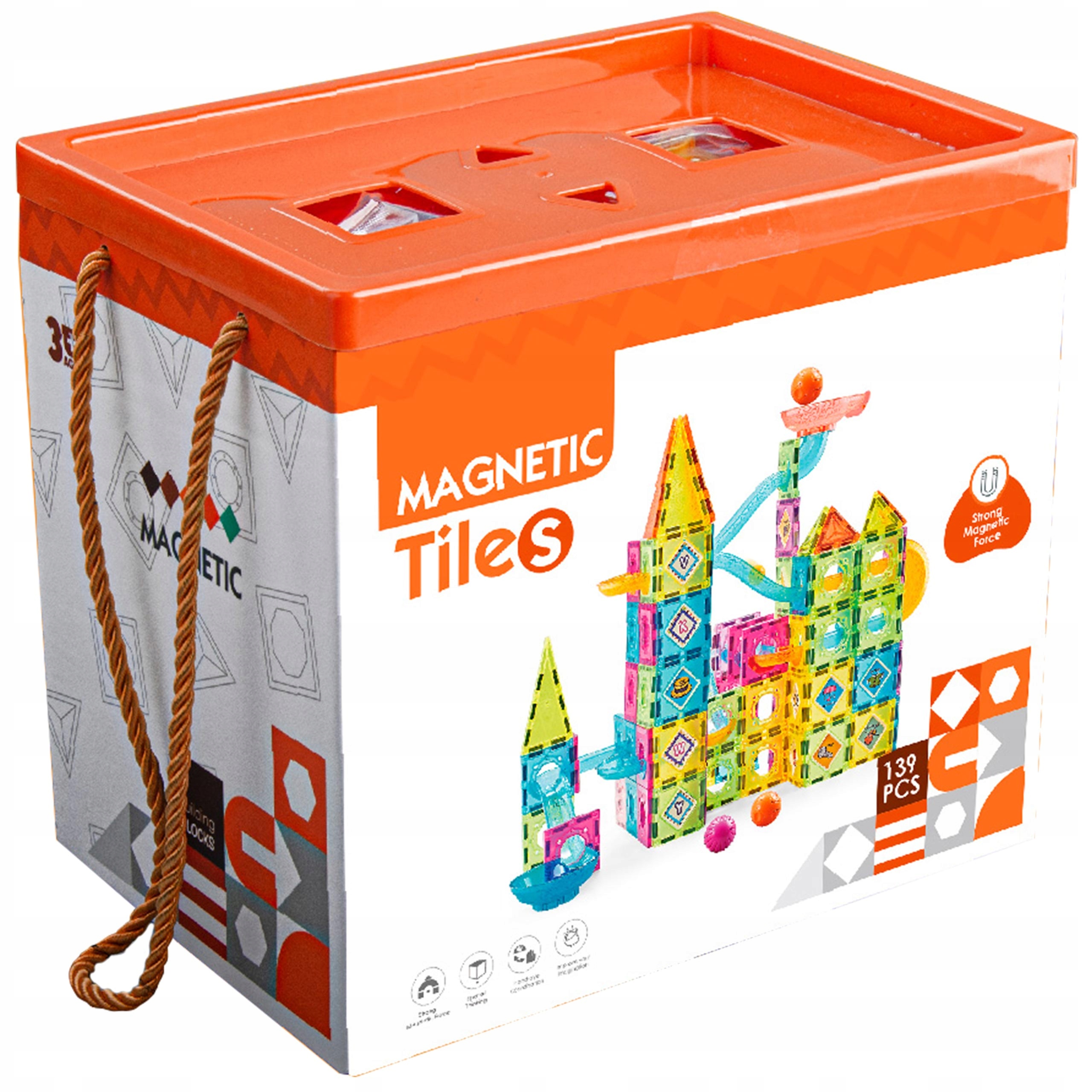 Набір включає: 71 магнітні блоки в різних кольорах та формах + аксесуари. Загалом набір має 139 елементів.