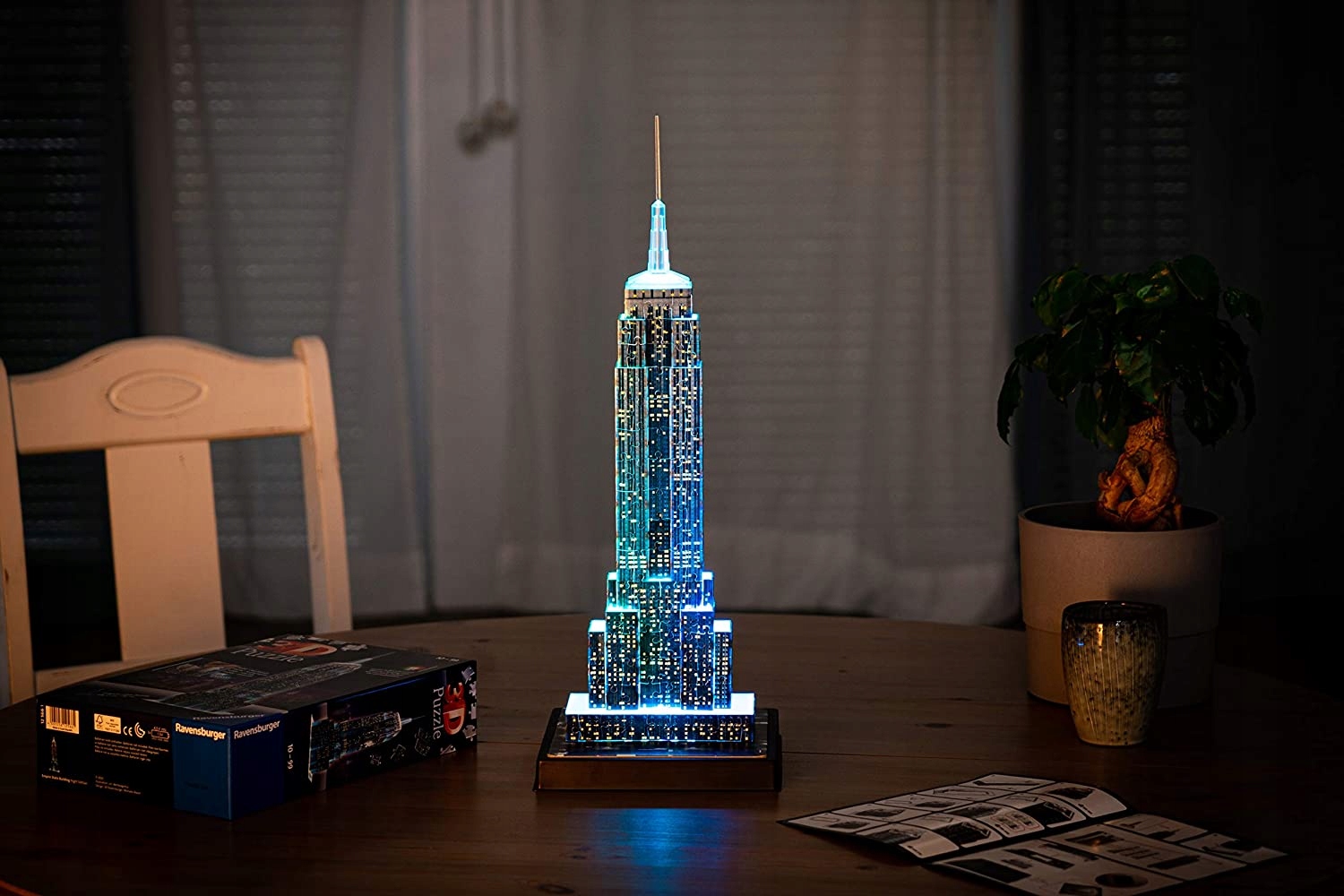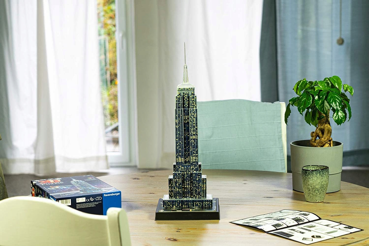 Створюйте унікальні конструкції за допомогою 3D-пазлів від Ravensburger! Відкрийте для себе новий тривимірний спосіб розгадування головоломок. Фрагменти цих головоломок виготовлені з міцного пластику, завдяки чому конструкція тримається разом без використання клею. Складені предмети не розсипаються, а пазли щільно злипаються. Матеріал, який використовується для виготовлення блоків,легко миється, просто використовуйте вологу ганчірку. Емпайр-Стейт-Білдінг із серії «Будівлі вночі» — це щось для любителів архітектури. 3D-головоломка — це точно відтворена будівля, яку ви можете тримати вдома. Крім пазла в набір також входять підставка та світлодіодні лампи.