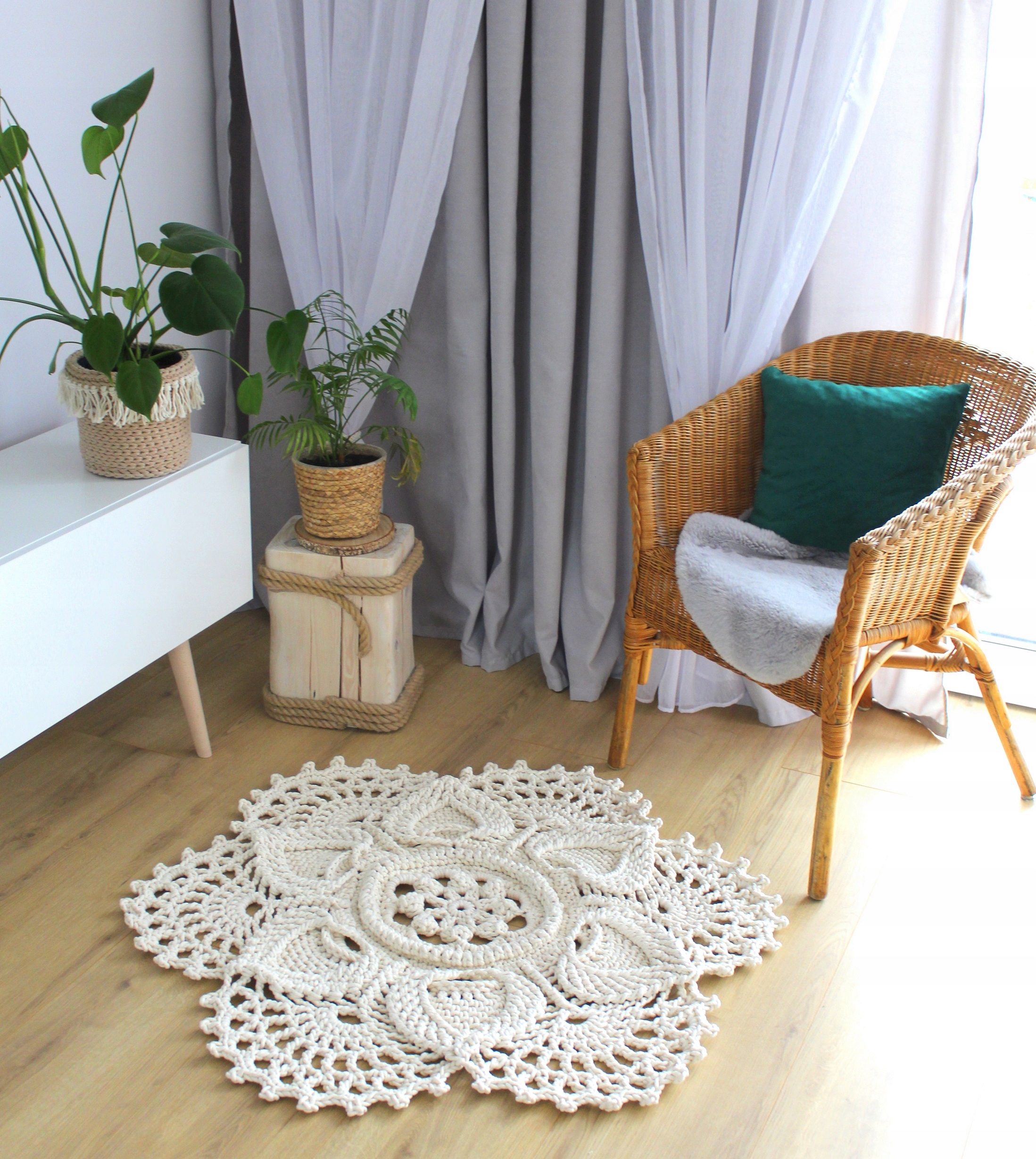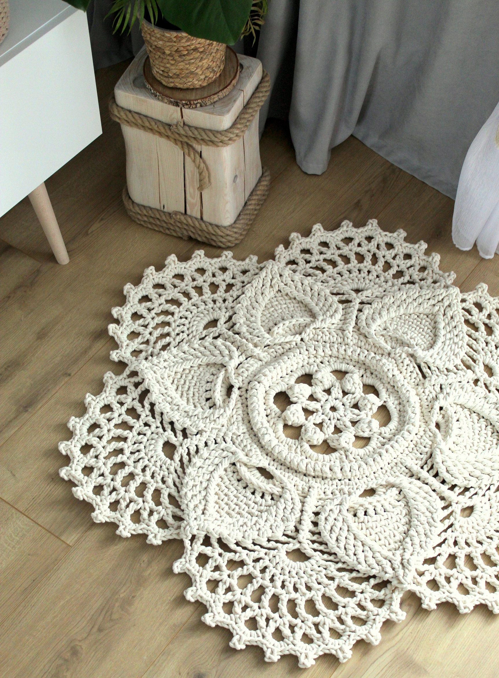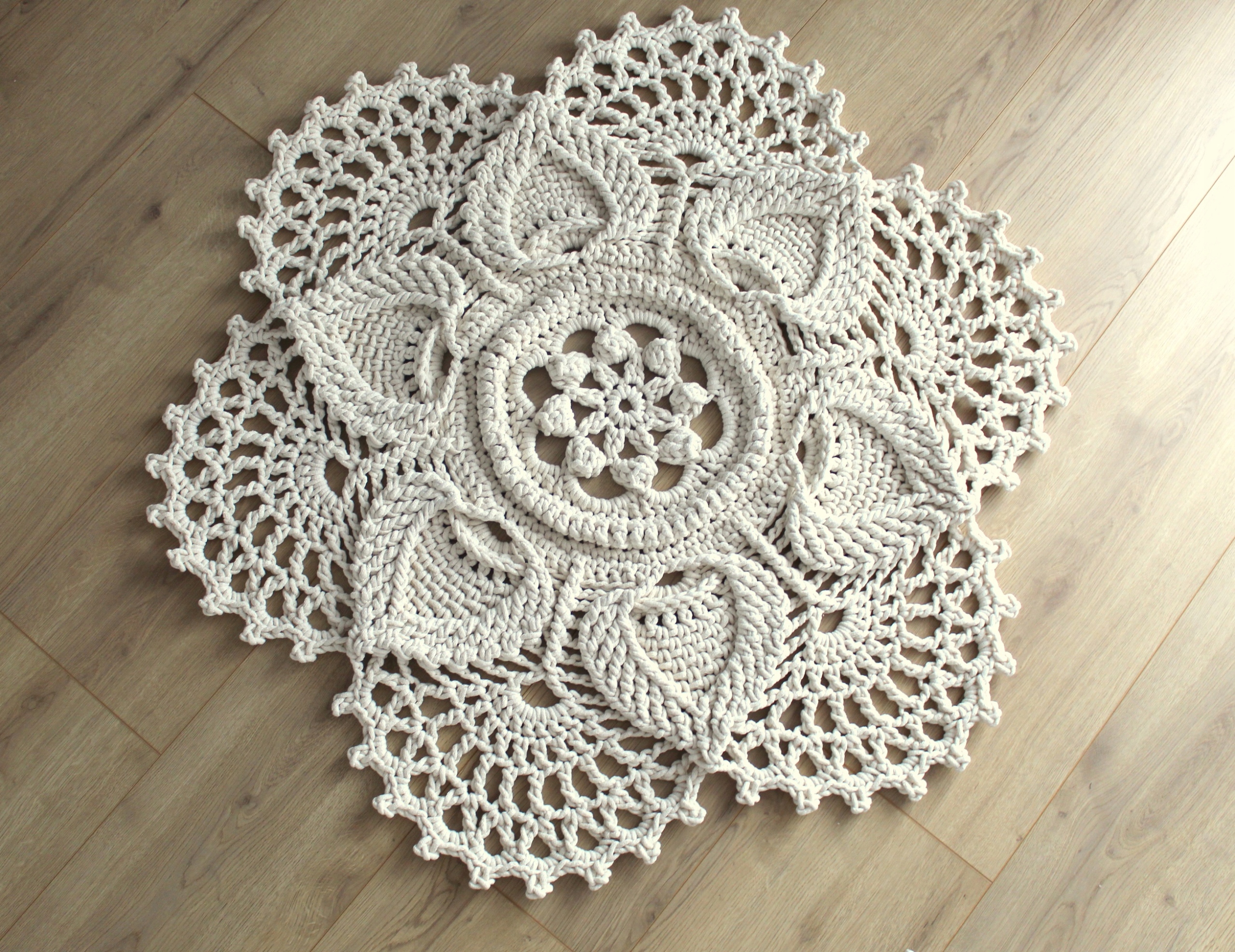 Килимок кремовий гачком виготовлений з пов'язаної нитки, у вигляді квітки з шістьма пелюстками, що закінчуються піко. Він має дивовижну структуру, місцями плоский, місцями більш опуклий, що надає йому ефекту 3D і водночас нагадує барельєф стародавніх майстрів мистецтва.