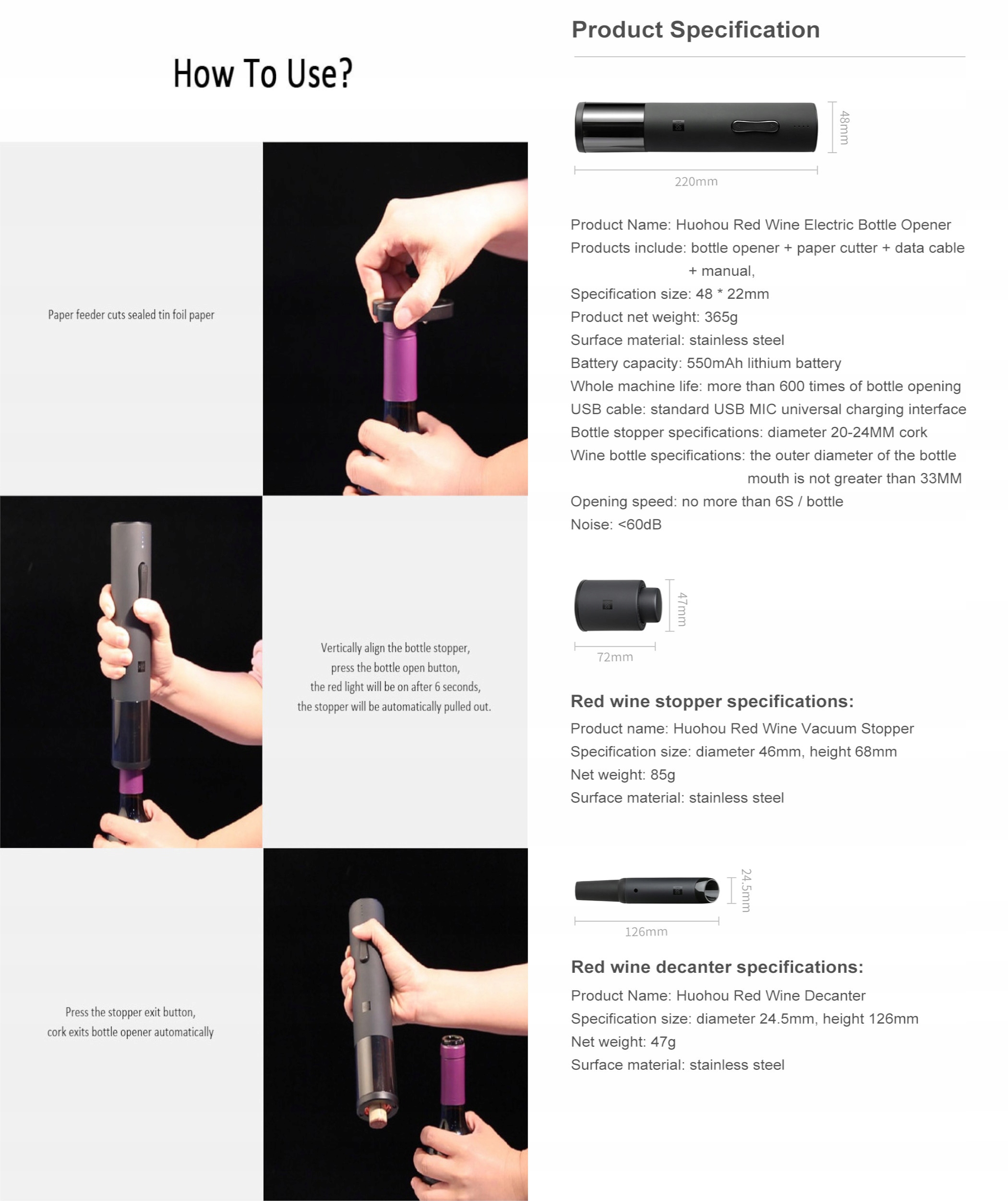 Цей електричний відкривач від Xiaomi зробить вечорами з коханим ще приємнішим. Ви зможете відкрити пляшку вина всього за 6 секунд, не використовуючи жодної сили, а не як з традиційними відкривачами. Просто утримуйте кнопку.