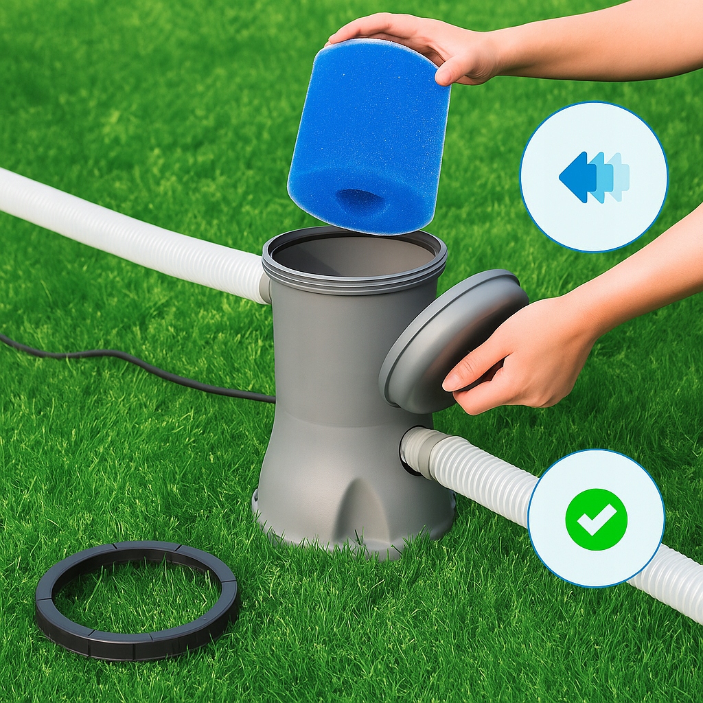 ✔ Відкрийте насос: Відкрутіть верхню кришку насоса, а потім вийміть прокладку фільтру та кришки фільтра.
