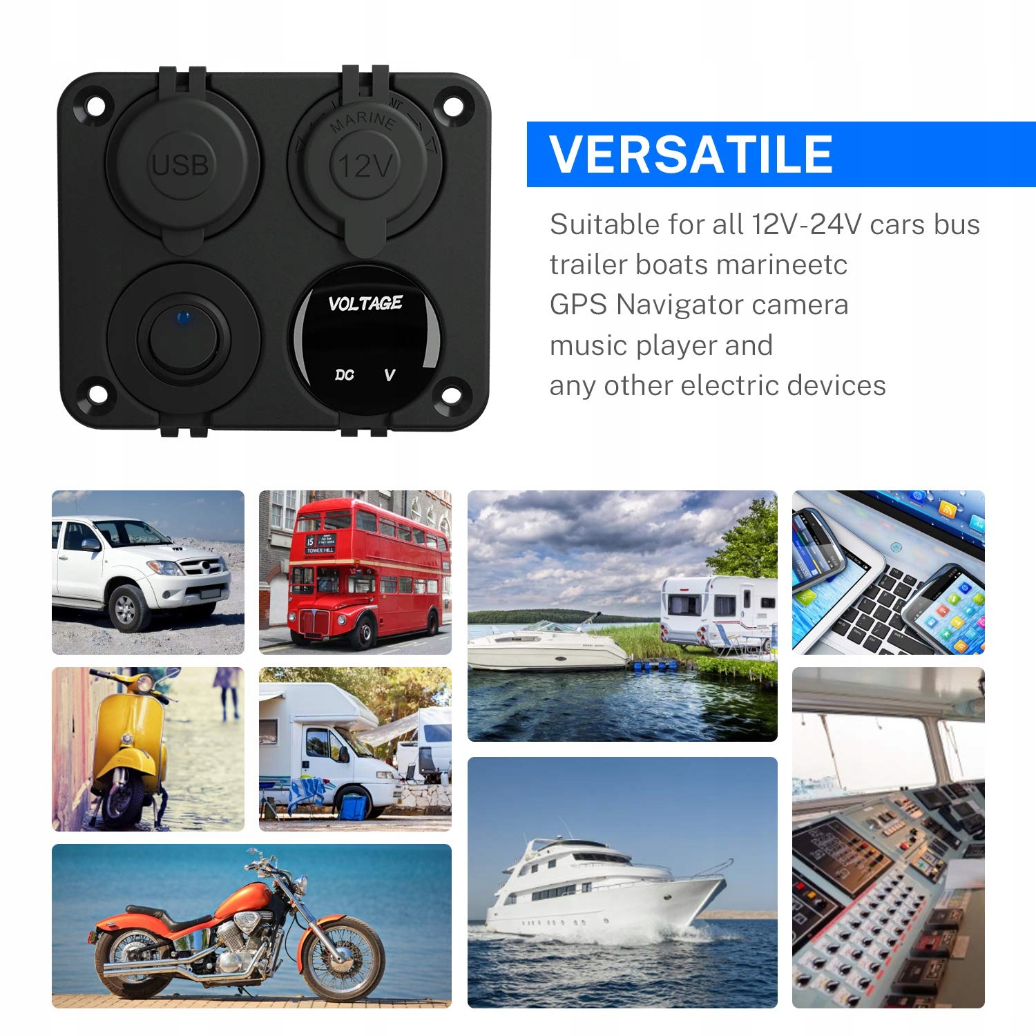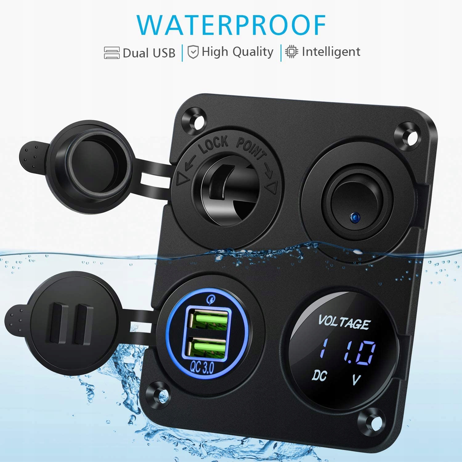 Подвійний USB -розетка + світлодіодний вольтметр + 12В розетка + перемикач , завдяки інтелектуальній ідентифікації всіх підключених пристроїв, Smart USB -порт забезпечує оптимальну швидку зарядку всіх пристроїв.