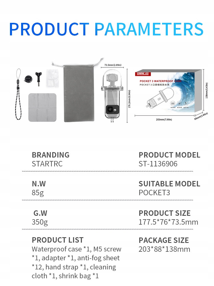 【Точна конструкція кнопок управління та стрижня Gimbal】 DJI Osmo Pocket 3 підводного човна характеризується конструкцією кнопок управління однією для одного. Кожне натискання кнопки безпосередньо відповідає його аналогу в кишені 3. Оснащений кнопками силікону, що дозволяє повним керувати налаштуваннями лінз та записувати функції, гарантуючи оптимальну зручність роботи, не завдаючи шкоди якості фотографій чи відео, пропонуючи більшу гнучкість під час роботи під водою. 1, гвинт x 1, Базрі База x 1, Лист антифура x 12, ремінь для рук x 1, Очищаюча тканина x 1, мішок для зберігання x 1