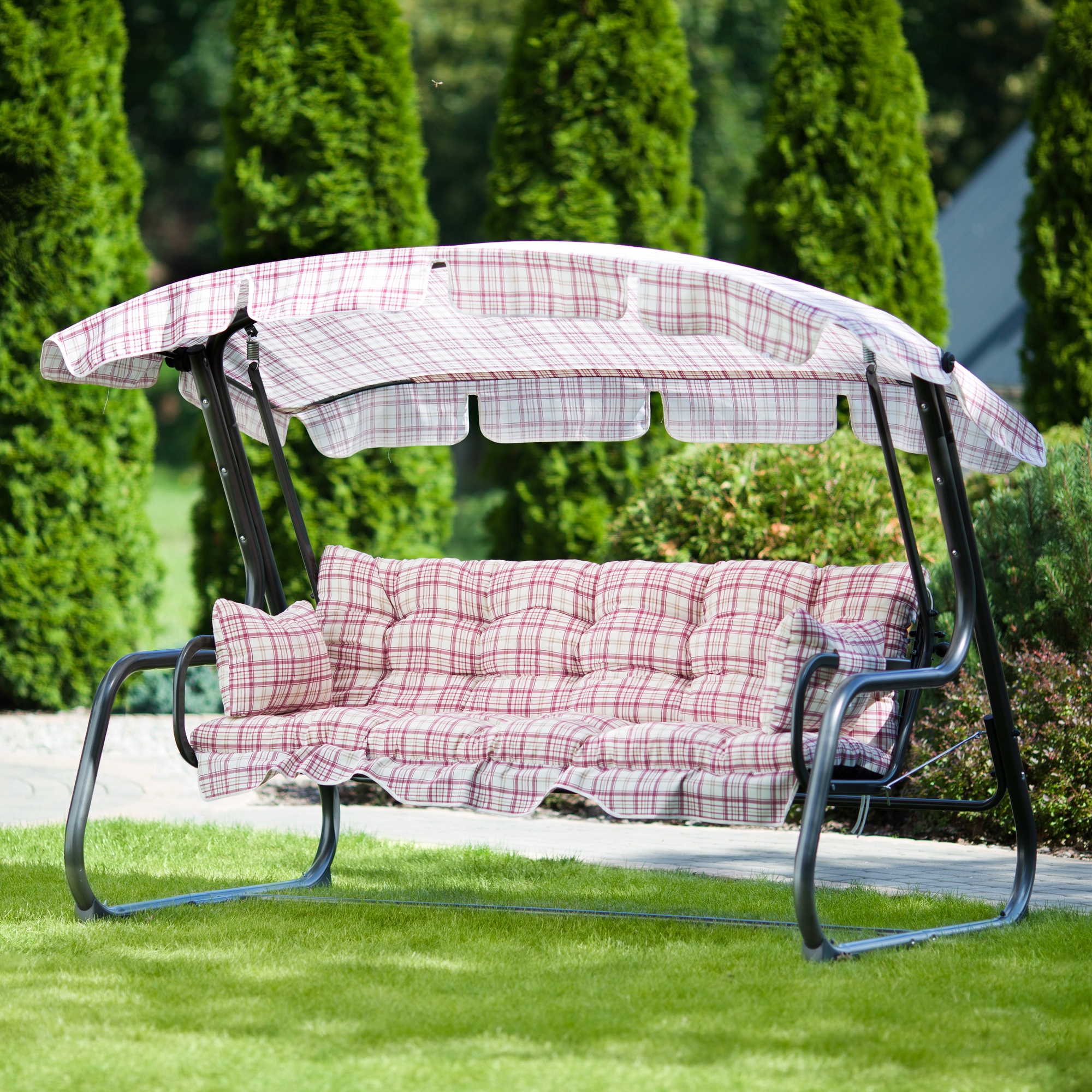 У комплекті з гойдалкою є: 1 х 2-частинна подушка для сидіння, стьобана в спинку і пришита x 10, має кріплення ремінців. Верхівка подушки оброблена тканиною полібей, а дно - з Лутрасіла. Наповнення подушки-губка флокації товщиною 8-10 см. Напруга оброблена поліестером, 2 х липучка для кріплення, оброблена тканиною з полібеном, наповненою густою губкою товщиною товщиною, товщиною товщиною 8-10 см, 1 X Полібавальна тканина дах у кольорі подушки.