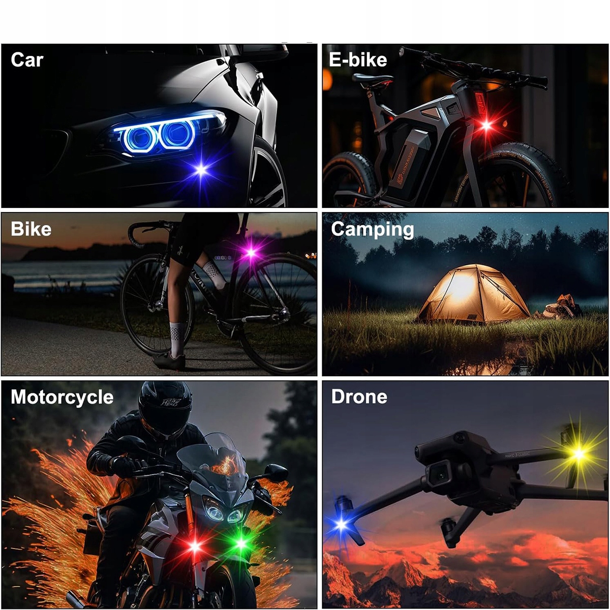 - Різноманітність кольорів: наші ліхтарі запобігання зіткненню доступні у 8 кольорах (білий, червоний, зелений, синій, жовтий, фіолетовий, рожевий, синій). 10 різних режимів: спалах із дистанційним керуванням, спалах із хлопками, швидкий спалах, спалах, повільний спалах і десять інших режимів. За потреби можна віддалено керувати різними кольорами та режимами.