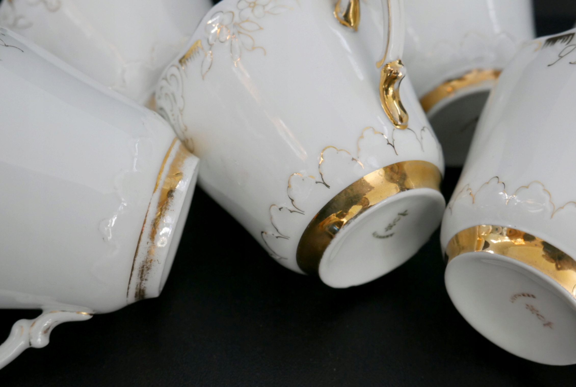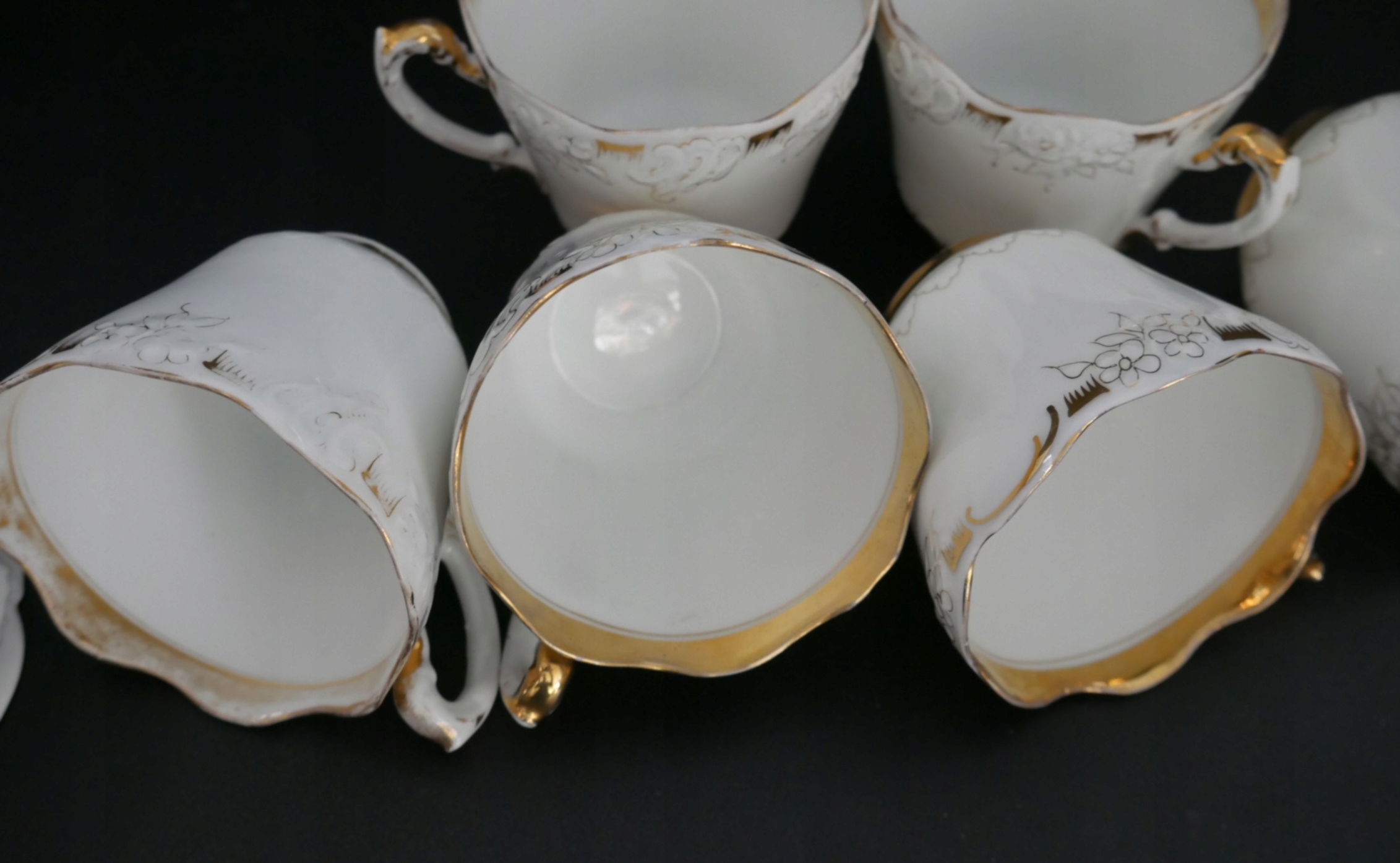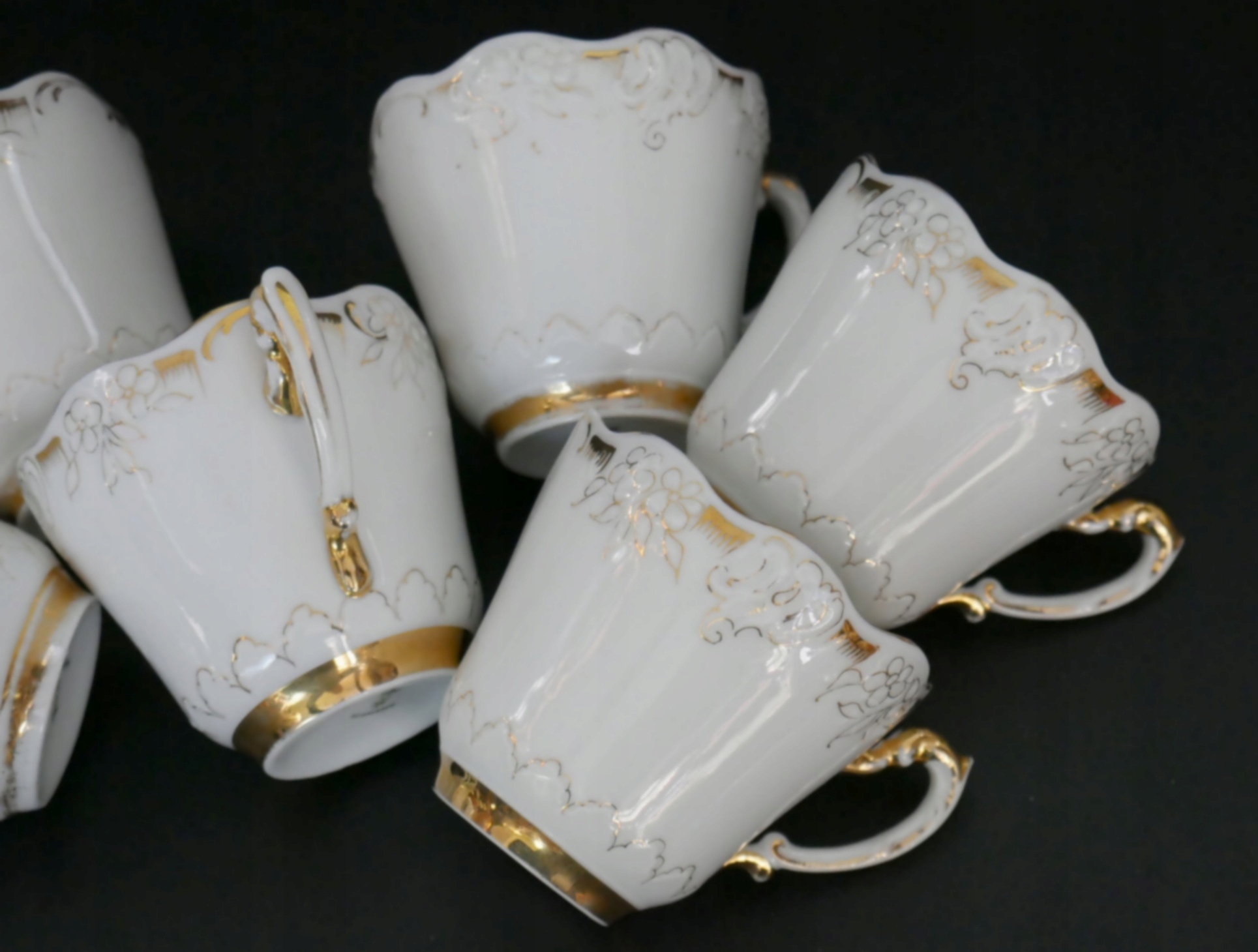чашки поодинокі, мінімальні пошкодження по обідку 1-2 мм, деякі майже непомітні, 1 чашка - значні потертості до позолоти, 1 додаткова з дефектом, основи без видимих пошкоджень, 1 мінімальний скол збоку основи.