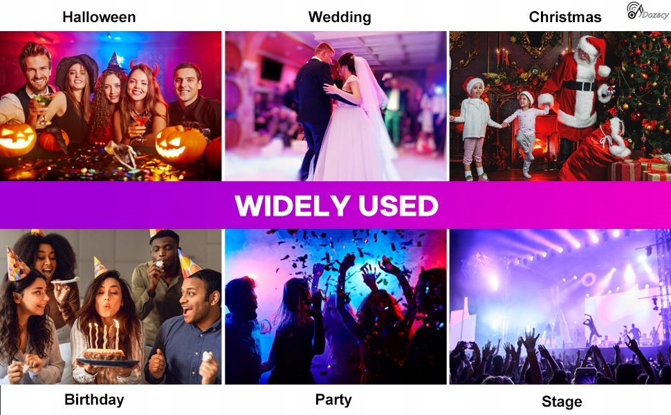 Туманна машина доступна в 13 кольорах і 4 спеціальних ефектах (згасання/спалах/згладжування/стробоскоп). Ідеально підходить для покращення атмосфери Хелловіну, свят, вечірок, сцен, весіль, живих концертів, ді-джеїв і сімейних зустрічей, караоке тощо.