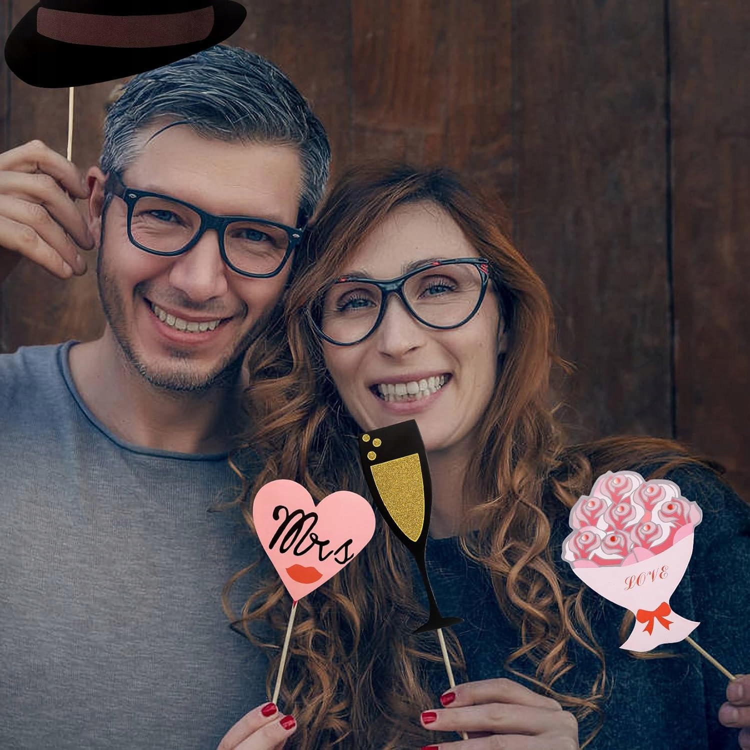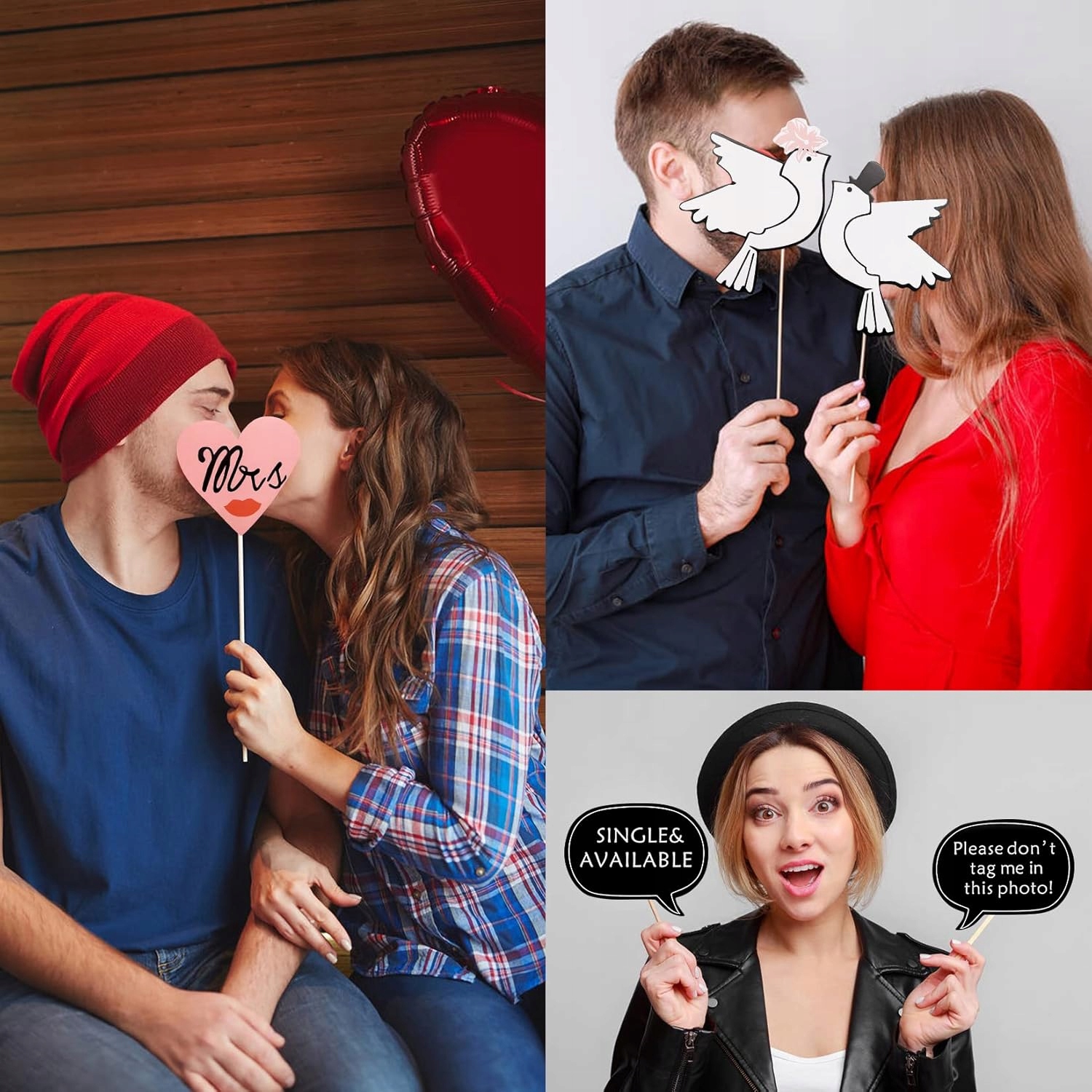- У набір входить: ви отримаєте 52 штуки весільного фотореквізиту, 52 штуки двосторонніх клейких стрічок і 52 штуки дерев’яних паличок, які зроблять ваші фотографії дуже цікавими.