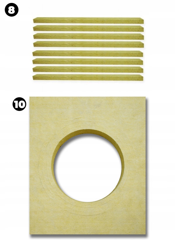 (10) ПЕРЕДНЯ ПАНЕЛЬ – виготовлена з негорючої, гідрофобізованої мінеральної вати. Його завдання - усунути напруги, які можуть виникнути в процесі експлуатації димоходу. Він також герметизує отвір у блоках димоходу, де котел під’єднується до димоходу.