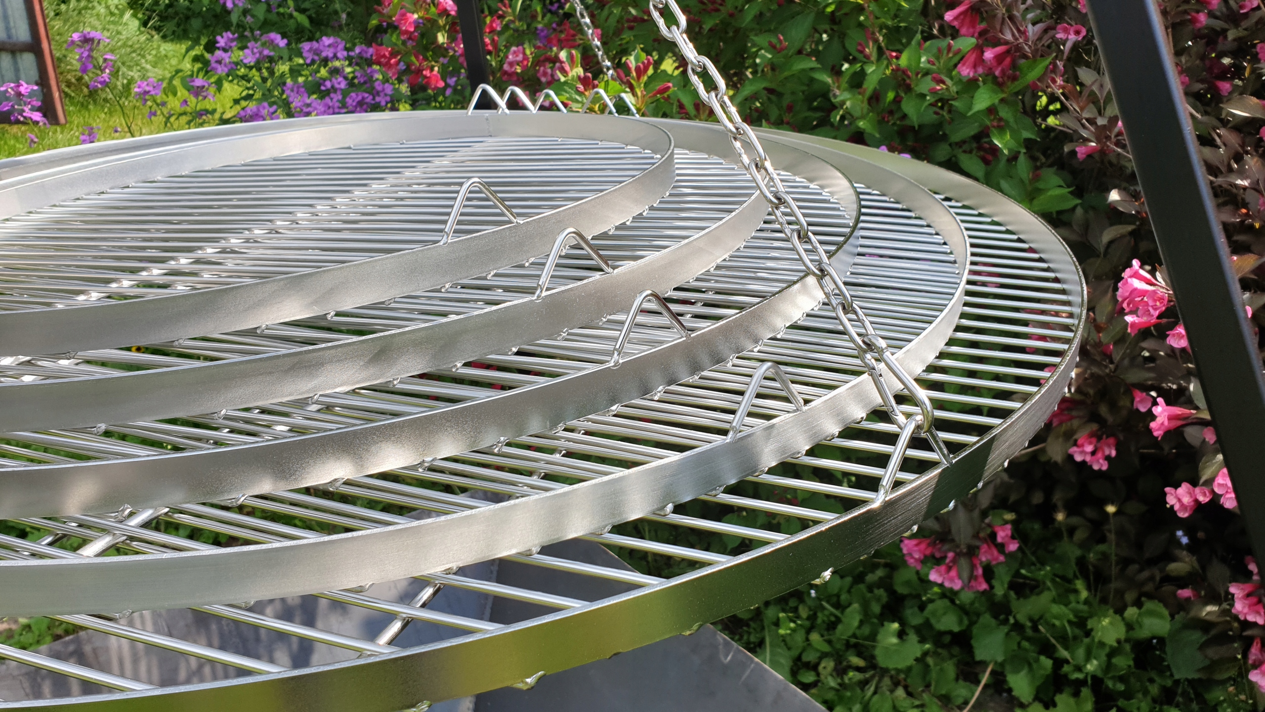 Високоякісна кругла решітка з нержавіючої сталі для підвішування над каміном діаметром 90 см . p>