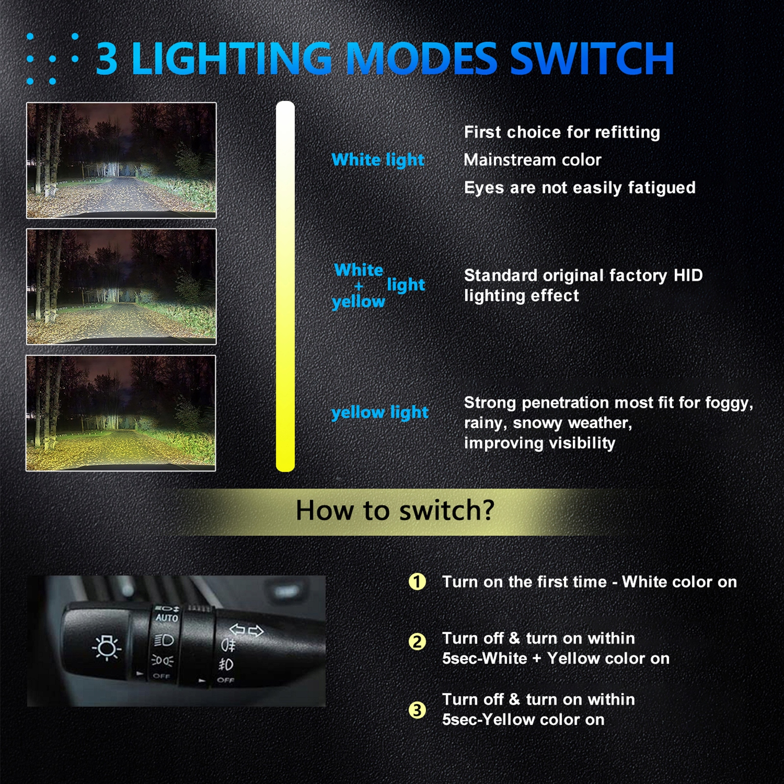 - 3-кольорова конструкція: 3 кольорів можна перемикати на Wola, лампочка фари може перемикатися між білим світлом завдовжки 6000 км, білим світлом 4300 к+жовтим світлом і 3000 000 жовтих світла для задоволення ваших потреб руху. Просто увімкніть/вимкніть, щоб перейти до потрібного світла світла.