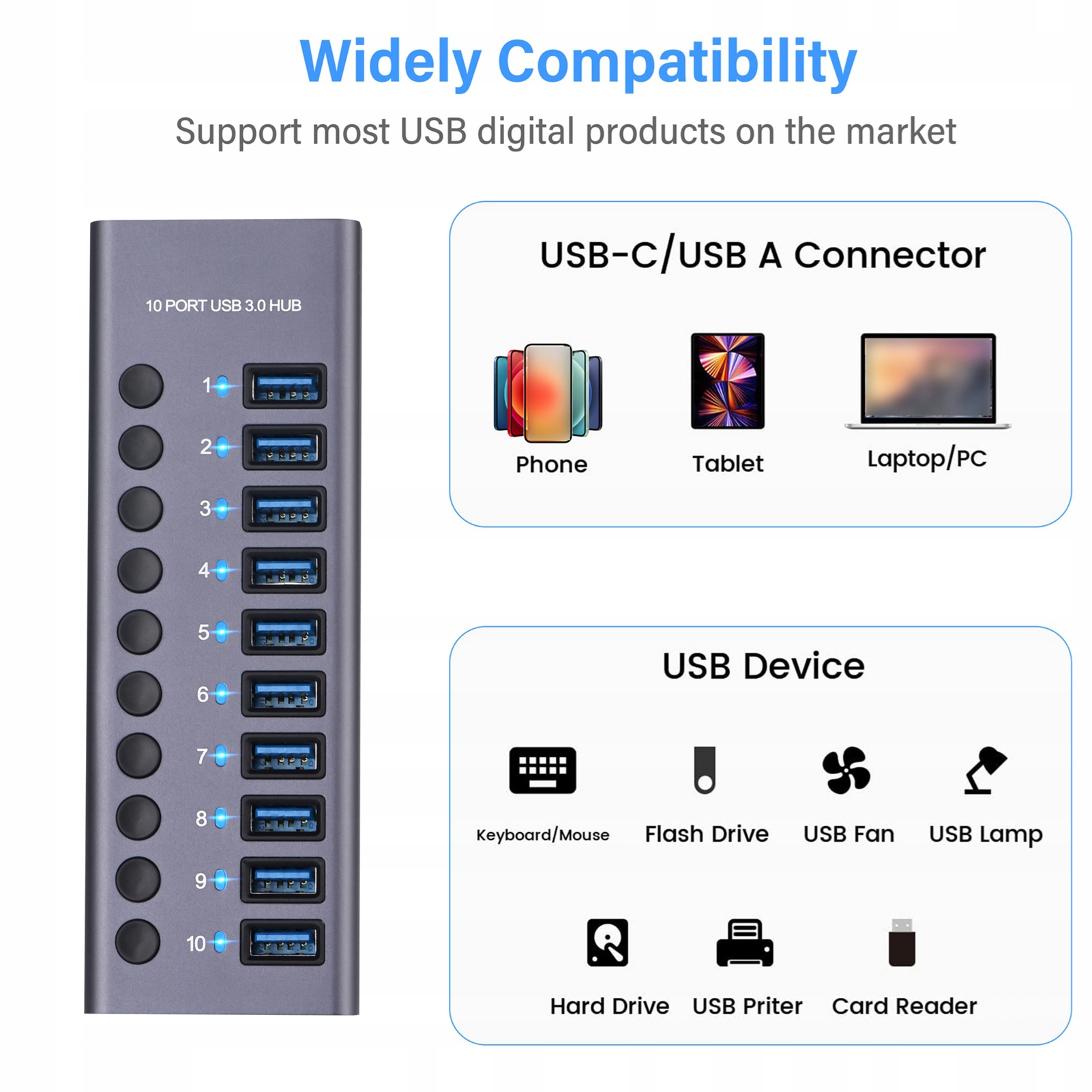 1. Hub USB 3.0 з портами USB 3.0 10pcs для більш зручного використання розширення, робочої функції роботи та швидкості передачі даних до 300 Мб/ с.