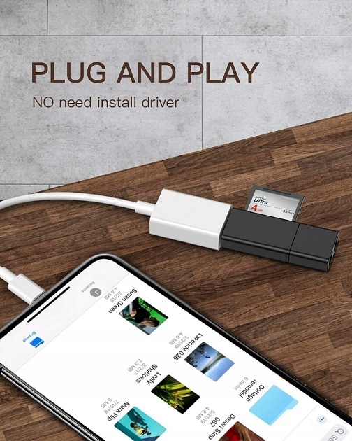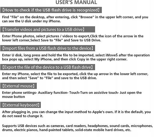 【Підтримувані формати】 для користувачів iOS 9.2-12.4 Цей адаптер USB-камери підтримує формати Photo та Raw, а також формати відео H.264 та MPEG-4, завантажені з цифрової камери. Фотографії/відео можна імпортувати лише з цифрової камери на пристрої iOS. Для користувачів I0S 13 або новішої системи це двоповерхова передача, ви можете імпортувати та експортувати фотографії, відео, файли MP3, файли MP4, Excel, Word, PPT, PDF у програмі "Файли" або "Фотографії". Просто знайдіть "файли" на робочому столі та натисніть "Переглянути", і ви побачите диск на своєму iPhone.
