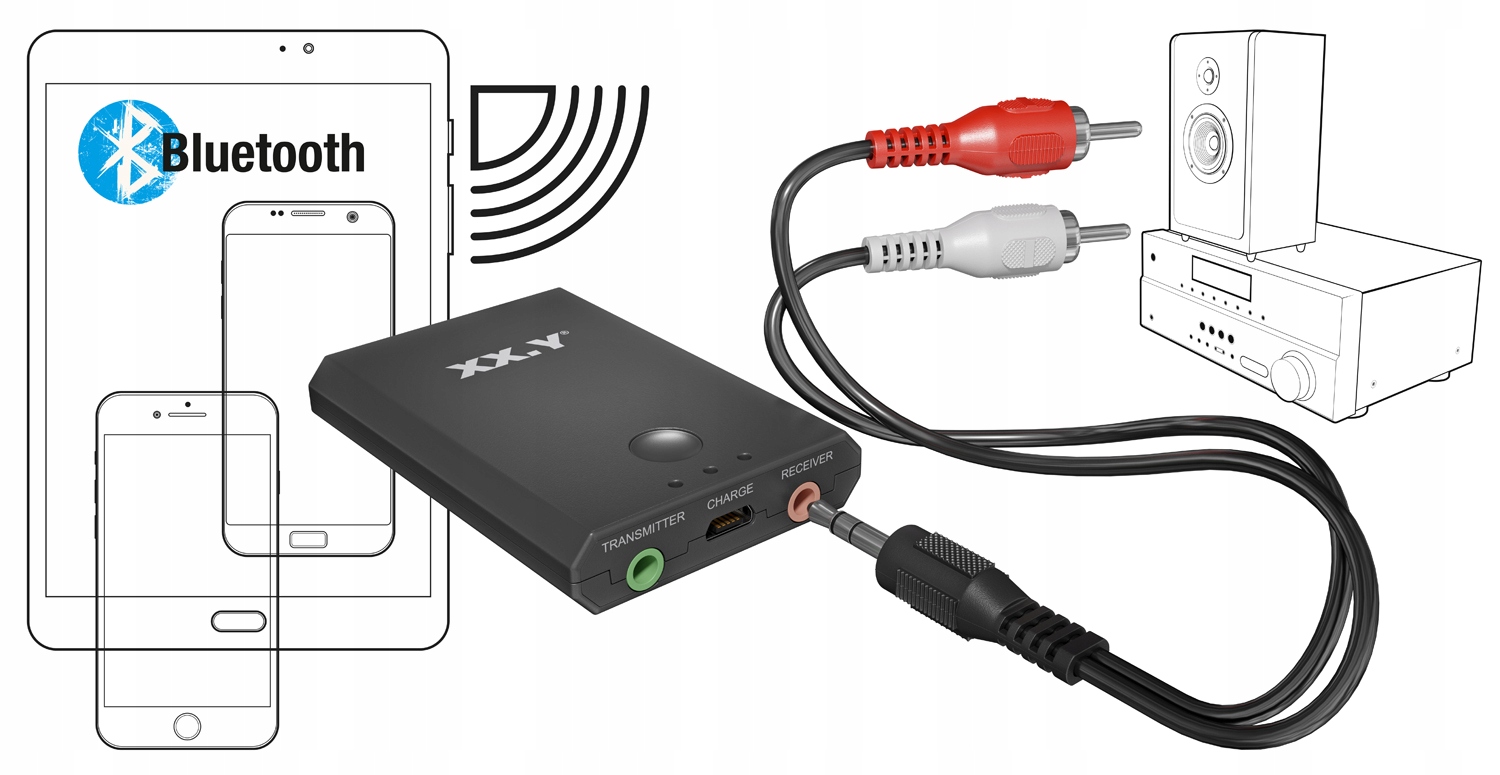 Змінює кожен аудіопристрою, не оснащений функцією Bluetooth з пристроєм Bluetooth. Звук бездротової передачі з смартфона/планшета/ноутбука з функцією Bluetooth для всіх аудіопристроїв, оснащених міні -входом Джек 3,5 мм або RCA, що не підтримує технологію Bluetooth. Для всіх навушників та динаміків з функцією Bluetooth.