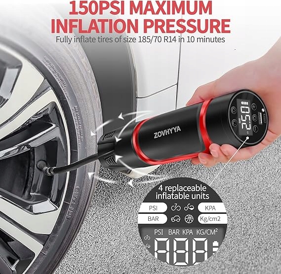 Zovhyya OK81 Повітряний компресор 150 фунтів на кв. Дюйм, електричний повітряний насос, 4500 мАг, міні -шинний насос, вхід типу U USB, велосипедний насос з цифровим світлодіодним світлом, для автомобіля, мотоцикла, кульки, плавального кільця тощо. Він має невеликі ознаки використання, як невеликі функції. Замінна упаковка. Немає змінних порад. Накачайте на шланг !!!