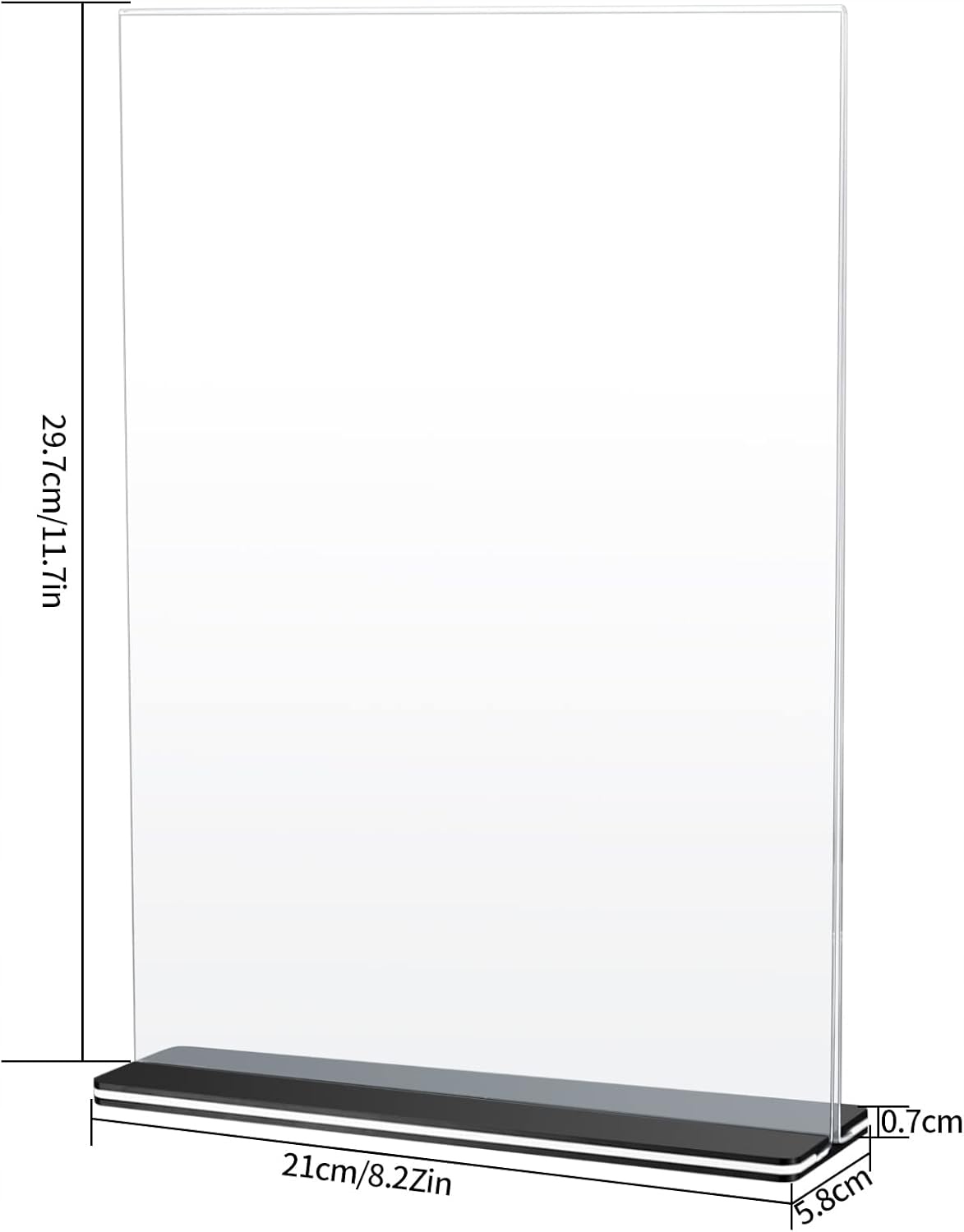 - Функціональна конструкція: Прозорий знак A4 -вивіски характеризується довговічністю та захистом від плям, подряпин та тріщин. Суцільна акрилова основа гарантує стабільне обслуговування представлених матеріалів.